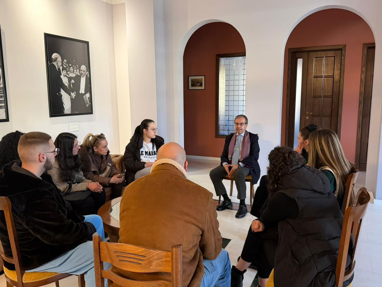 Στις 11 Μαρτίου 2026 το Γενικό Προξενείο της Ελλάδας στην Κορυτσά επισκέφθηκαν φοιτητές και φοιτήτριες Πολιτικών Επιστημών του Πανεπιστημίου Fan Noli, που συνοδεύονταν από την Πρόεδρο του Τμήματος Κοινωνικών Επιστημών του Πανεπιστημίου κα Suela Dinellari και από το Λέκτορα του Τμήματος κ. Jordan Jorgji. Οι φοιτητές και οι φοιτήτριες, αφού ξεναγήθηκαν στο ιστορικό κτήριο του Γενικού Προξενείου, είχαν την ευκαιρία να συζητήσουν με το Γενικό Πρόξενο της Ελλάδας στην Κορυτσά κ. Αστέριο Μπουζιά για θέματα που άπτονται των σπουδών τους, καθώς και για το επάγγελμα και το ρόλο του Διπλωμάτη.