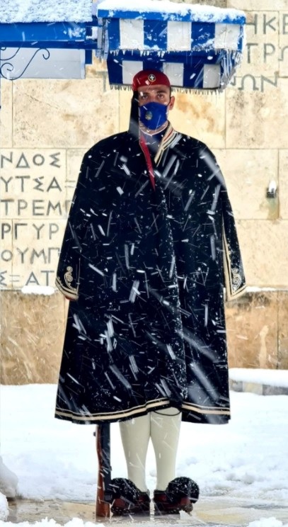 Η σφοδρή χιονοθύελλα (24/1/2022) που έφτασε μέχρι το κέντρο της Αθήνας, εκτός από το χάος στους δρόμους, προσέφερε και μερικές εντυπωσιακές φωτογραφίες από τις προετοιμασίες της Προεδρικής Φρουράς απέναντι στο ψύχος. Ετσι, στους Εύζωνες χορηγήθηκαν οι χειμερινοί μπλε ντουλαμάδες (Στολή του Μακεδονικού Αγώνα) ενώ υπήρξε φροντίδα και για την ομαλή αλλαγή Φρουράς.