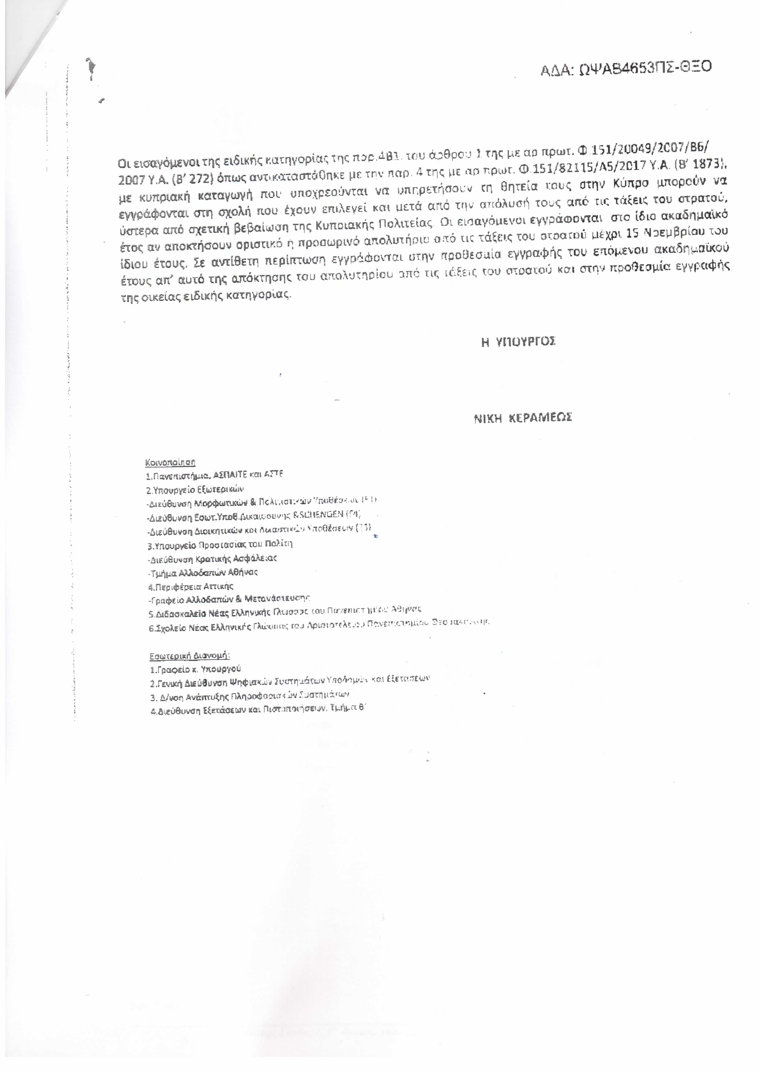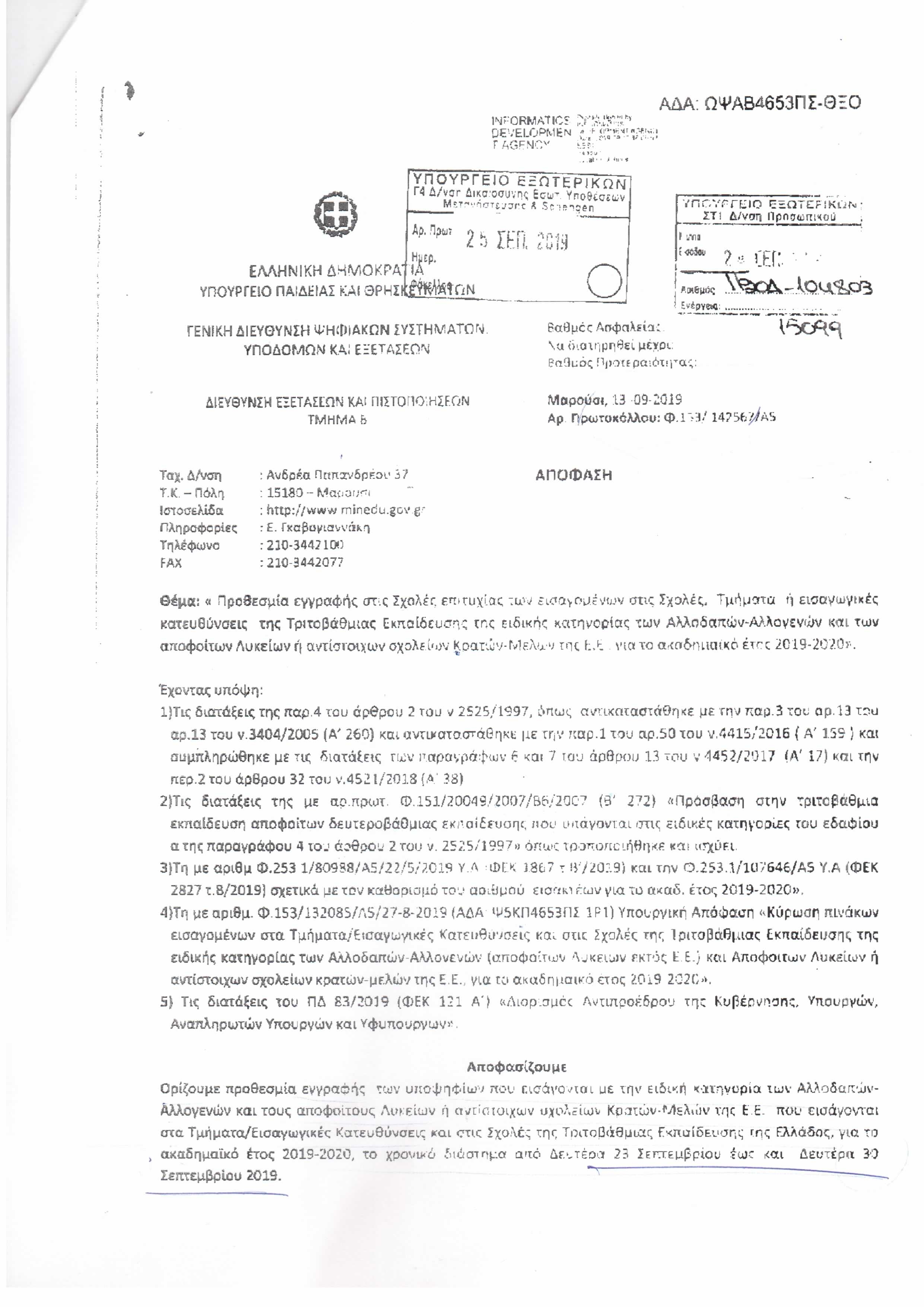 Προθεσμία εγγραφής στις Σχολές επιτυχίας των εισαγομένων στις Σχολές, Τμήματα ή εισαγωγικές κατευθύνσεις της Τριτοβάθμιας Εκπαίδευσης της ειδικής κατηγορίας των Αλλοδαπών-Αλλογενών και των αποφοίτων Λυκείων ή αντίστοιχων σχολείων Κρατών Μελών της Ε.Ε. για το ακαδημαϊκό έτος 2019-2020