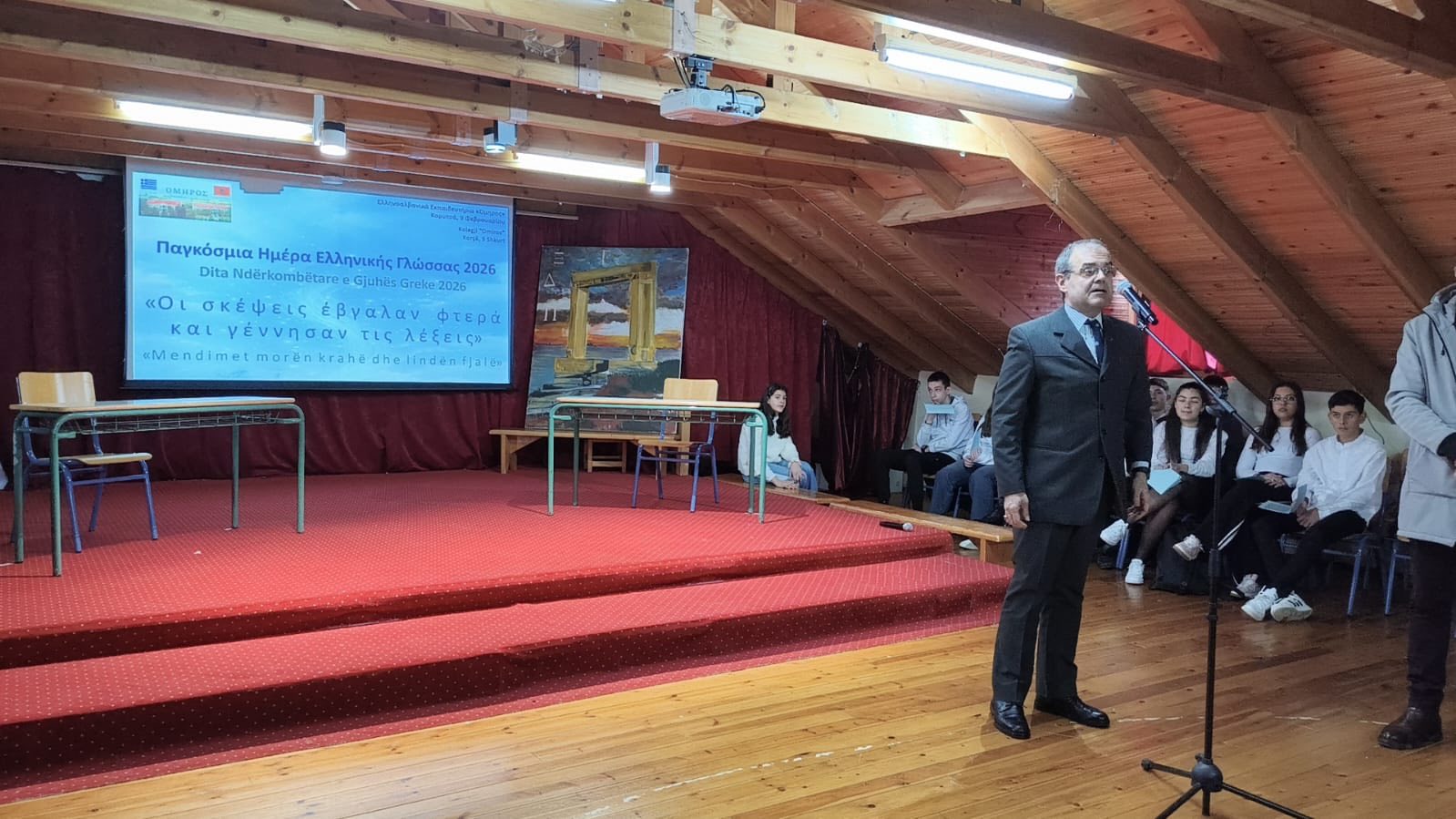 Συμμετοχή του Γενικού Προξένου κ. Α. Μπουζιά στις εκδηλώσεις για την Παγκόσμια Ημέρα Ελληνικής Γλώσσας στα Ελληνοαλβανικά Εκπαιδευτήρια «Όμηρος» και στο Λύκειο «Πλάτων» (9/2/2026)
