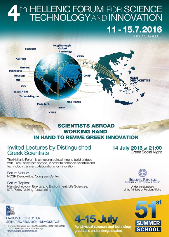 The National Center for Scientific Research (NCSR) “Demokritos”, the largest multidisciplinary research center in Greece, is organizing for the 4th consequent year the Hellenic Forum for Science, Technology and Innovation taking place from July, 11th to July 15th, 2016 at the NCSR “Demokritos” Congress Center in Athens, Greece under the auspices of the Ministry of Foreign Affairs.