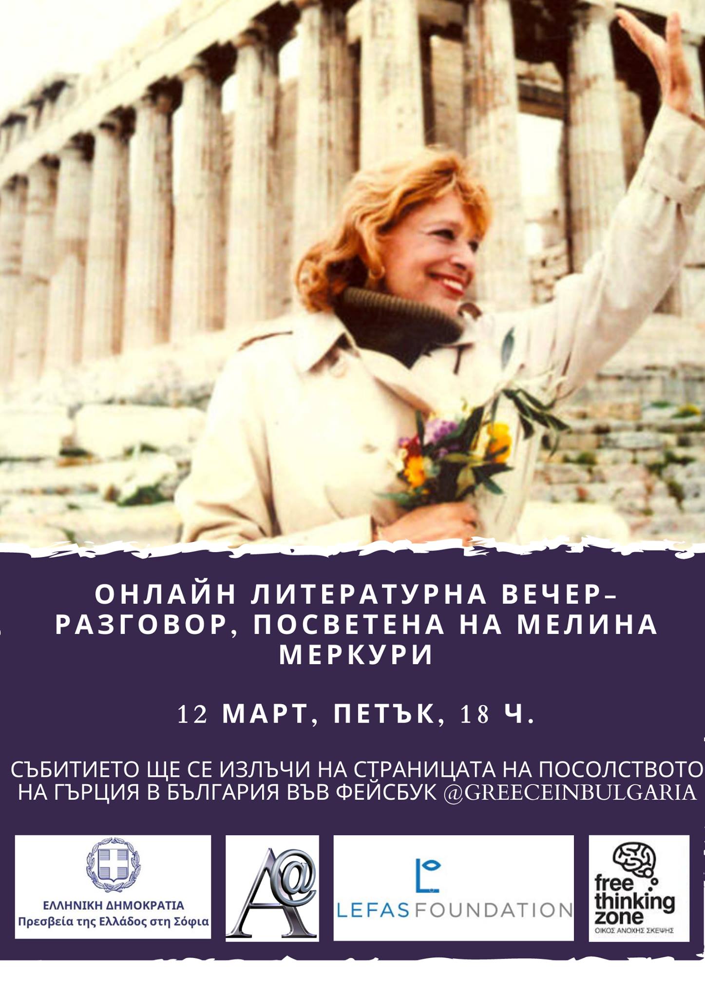 По повод навършването на 100 години от рождението на Мелина Меркури през октомври миналата година (2020 г. бе обявена за година на Мелина Меркури), както и на 27 години от смъртта на голямата гръцка актриса и изпълнителка на 6 март 1994 г., посолството на Гърция в София, в сътрудничество с издателството „Free Thinking Zone“, фондацията Lefas Humanitas и дружеството „Аристотел – мост за култура“, организира на 12 март от 18 ч. онлайн събитие, посветено на връзките на Меркури с България и гледните точки на новите поколения в областта на изкуствата и културата в България към отпечатъка, оставен от нея в културата и областта на опазването на световното културно наследство.