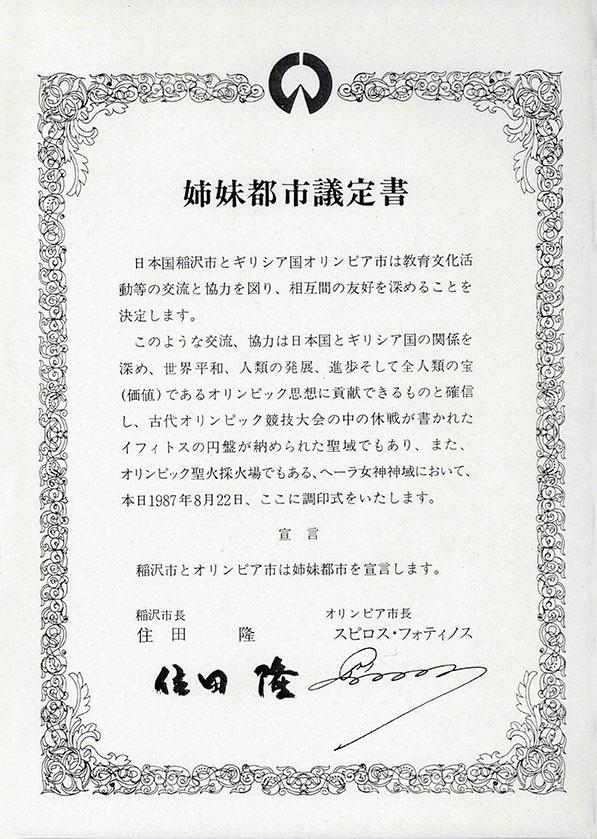Πράξη Αδελφοποίησης των πόλεων Αρχαίας Ολυμπίας και Ιναζάβα - Act of Twinning of the cities of Ancient Olympia and Inazawa