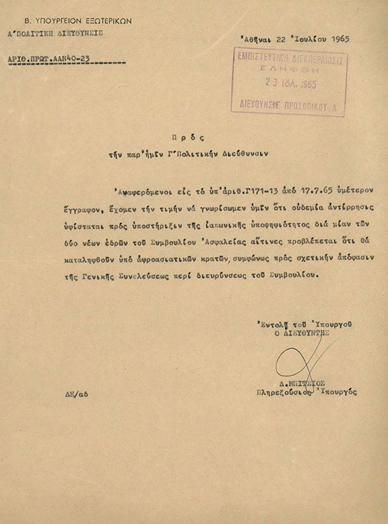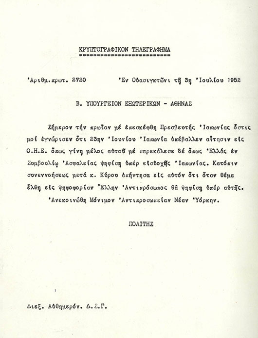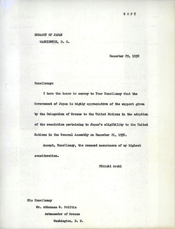 Ευχαριστίες Ιαπωνίας για την υποστήριξη της Ελλάδας στην ένταξη της Ιαπωνίας στον ΟΗΕ - Gratitude of the Japanese Government for Greece's support to Japan's accession to the UN