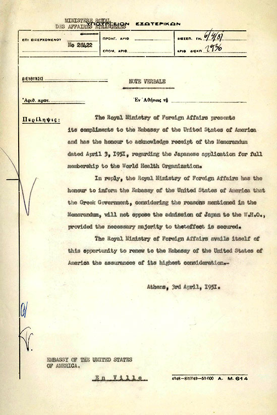 Μη διατύπωση αντίρρησης Ελλάδας στην εισδοχή της Ιαπωνίας στην Παγκόσμια Οργάνωση Υγείας - Non-opposition of Greece to the admission of Japan to the World Health Organization