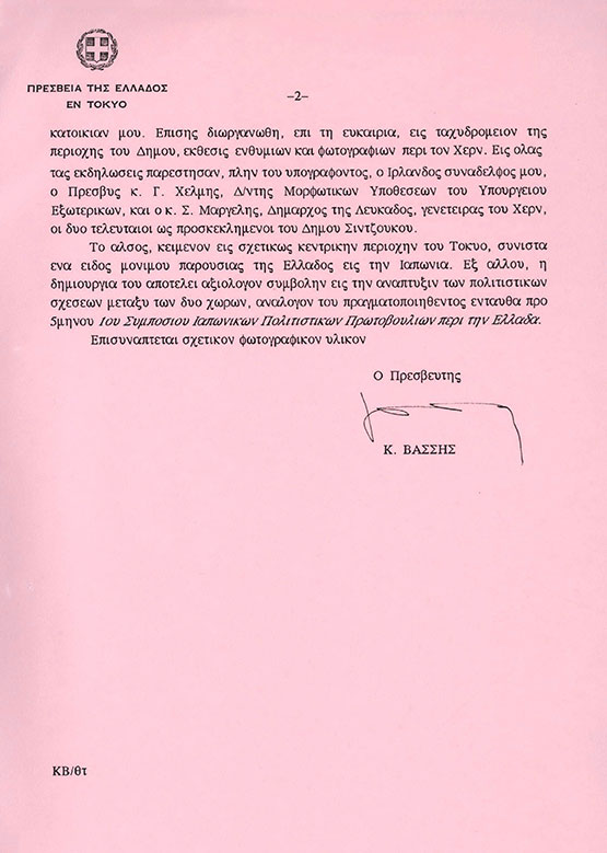 27 Απριλίου 1993 - Ο Έλληνας Πρέσβης στο Τόκυο Κωνσταντίνος Βάσσης ενημερώνει το Υπουργείο Εξωτερικών σχετικά με τα εγκαίνια άλσους στον Δήμο Σιντζούκου της ιαπωνικής πρωτεύουσας στη μνήμη του Λευκάδιου Χερν.