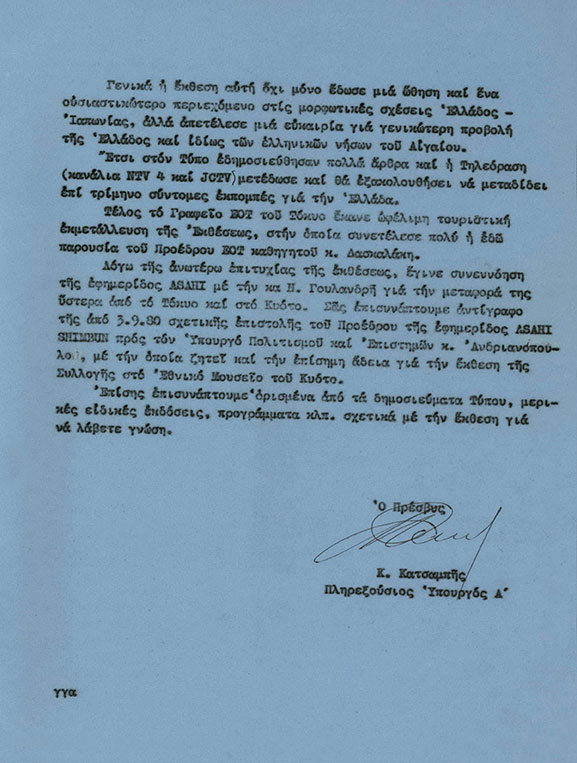 8 September 1980 - The Greek Embassy in Tokyo informs the Greek Ministry of Foreign Affairs about the presentation of an exhibition entitled "Ancient Greek Art of the Aegean Islands" in Tokyo, with exhibits from the N. Goulandris collection.