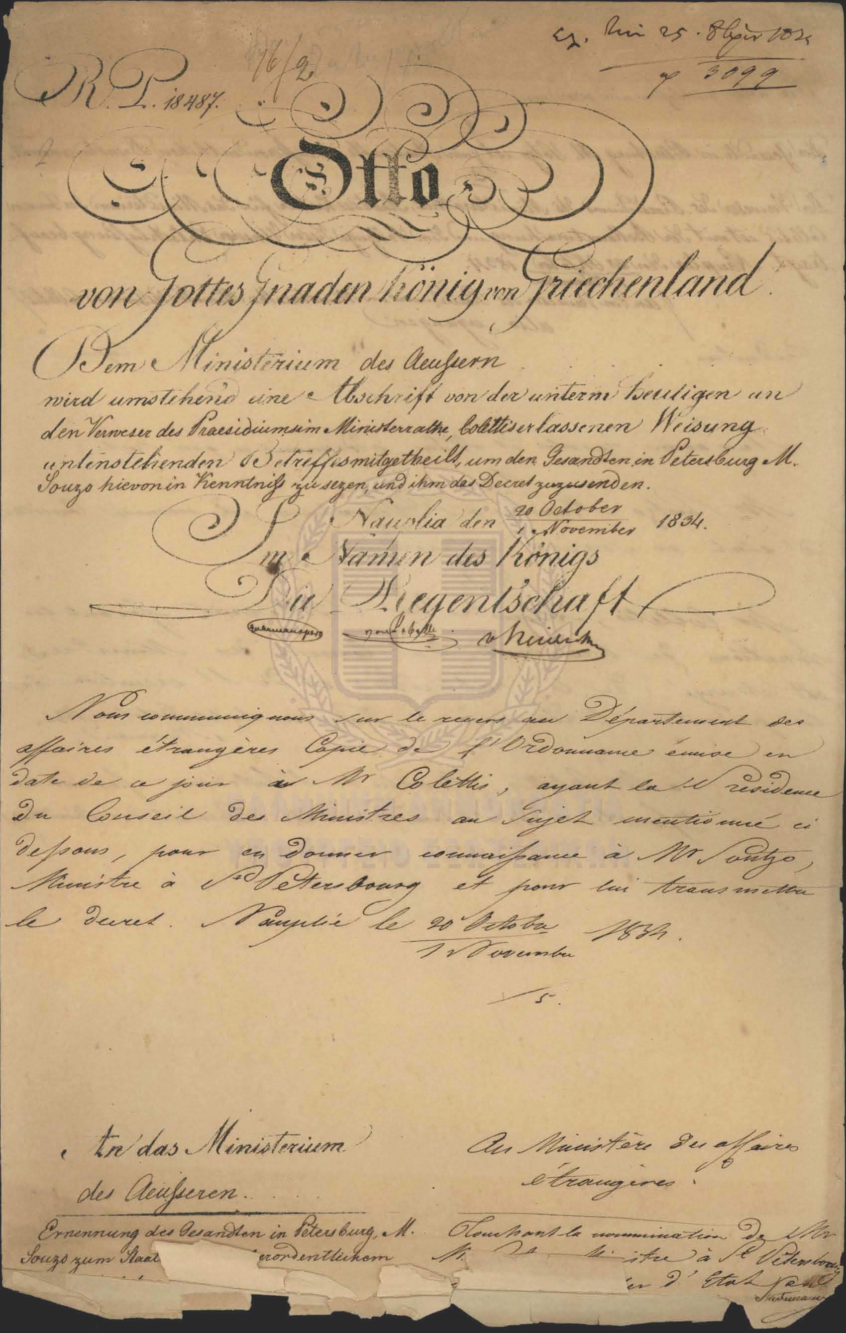 1 Novembre 1834. Décret sur la nomination de M. Soutzo comme Envoyé (Ambassadeur) à Saint-Pétersbourg, en Russie, signé par le Roi Othon.