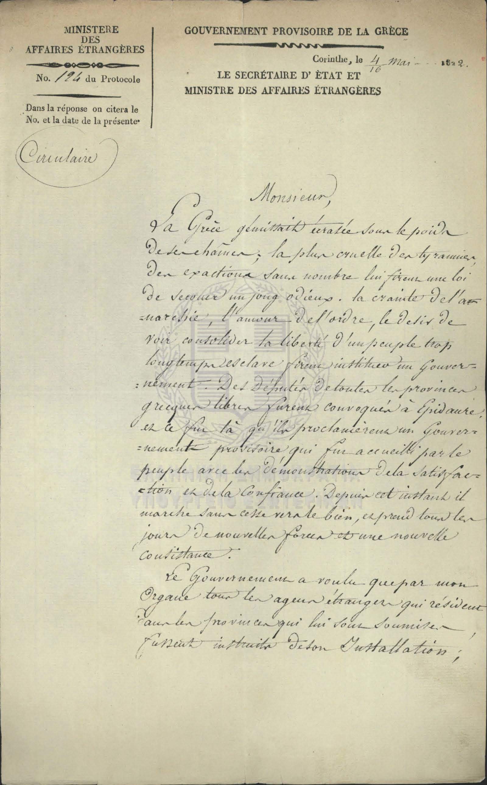 4/16 May 1822. Almost a year after the beginning of the Greek War of Independance, the Minister of Foreign Affairs of the Provisional Government of Greece Theodoros Negris invites consular and diplomatic representatives of foreign governments located in the liberated Greek territories to be accredited to the Greek Government (Service of Diplomatic and Historical Archives, Central Service Archives 1957, File B)
