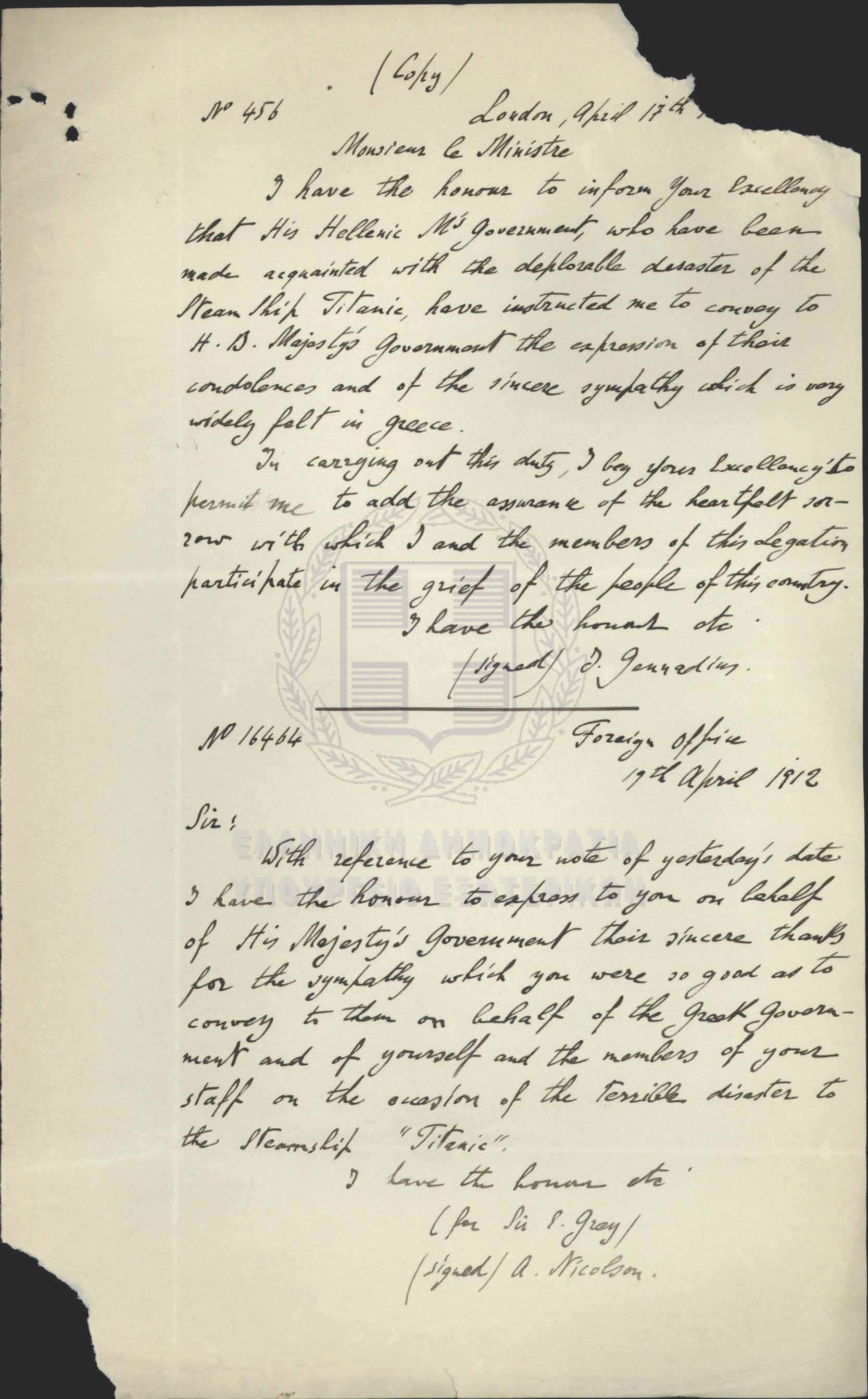 17 and 19 Αpril 1912. Copy of the letter of condolences dispatched by the Greek Ambassador in London I. Gennadios to the British government on the sinking of the Titanic, and the reply of the Foreign Office (Service of Diplomatic and Historical Archives, Central Service Archives 1912, File 56.6, p.4)