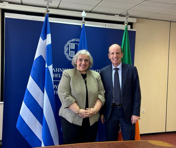 DFM Papadopoulou welcomed today 🇮🇪 SG Joe Hackett in Athens. Following an in depth exchange of views on european and regional issues the two sides adopted a roadmap to further consolidate bilateral cooperation in all fields, including @UN, #diaspora ties and #education