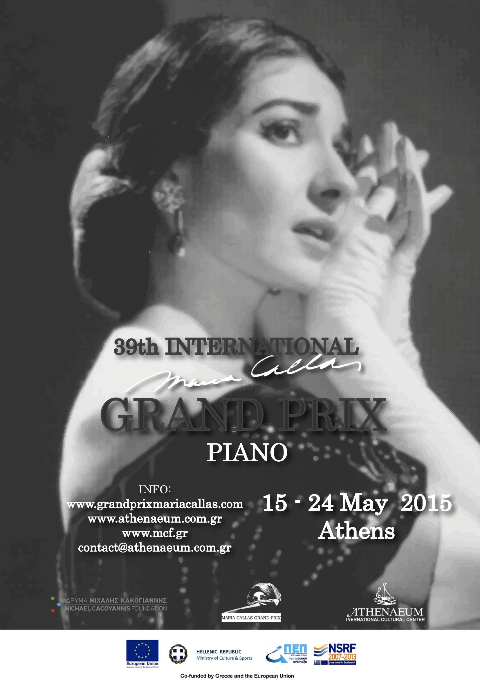 Le Centre Culturel international Athenaeum, en collaboration avec la Fondation Michael Cacoyannis et le soutien financier du programme CRSN, organise le 39ème Grand Prix international "Maria Callas in Piano" qui se déroulera du 15 au 24 mai 2015 à Athènes. Cette année, le grand Prix Maria Callas a l'honneur d'accueillir le célèbre pianiste et professeur Dmitri Bashkirov qui présidera le jury international.