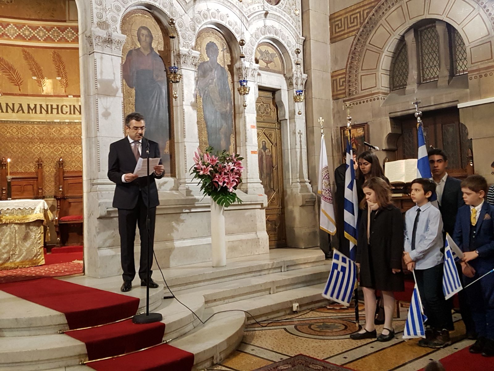 A l'occasion de la célébration de la fête nationale, le 25 Mars 2018, une doxologie a eu lieu dans la cathédrale de Saint Stéphane, célébrée par Son Eminence le Métropolite Orthodoxe de France Monsieur Emmanuel, et en présence du Chargé d'affaires a.i. de Grèce en France, M. Ioannis - Miltiadis Nikolaidis. Un dépôt de gerbe sur la Tombe du Soldat Inconnu à l’Arc de Triomphe a suivi, en présence de nombreux membres de la communauté grecque de Paris.