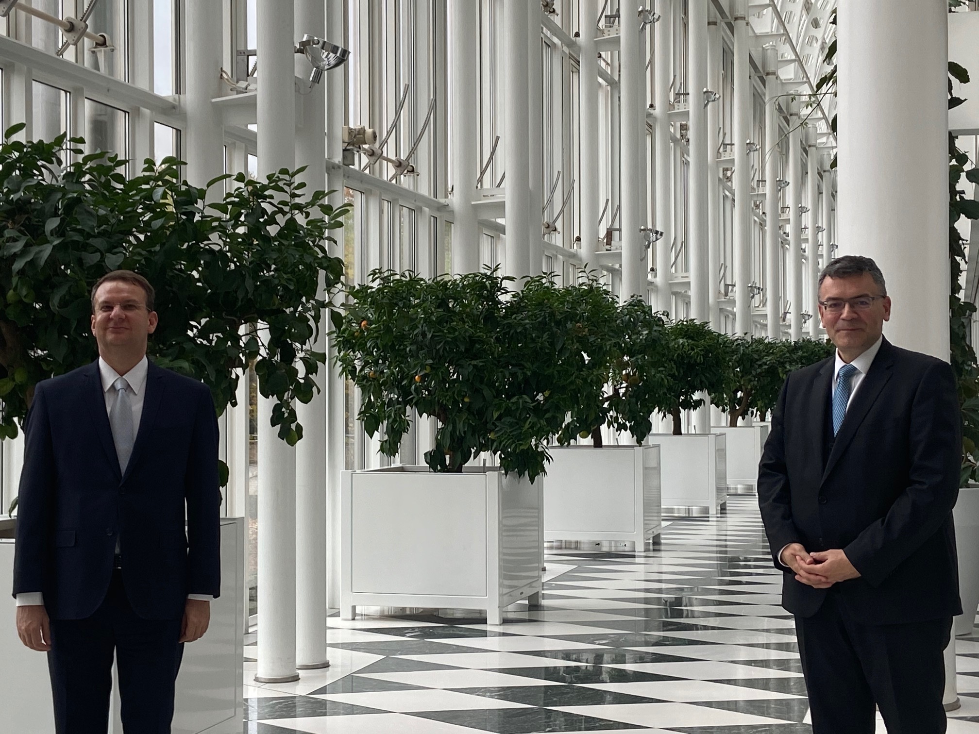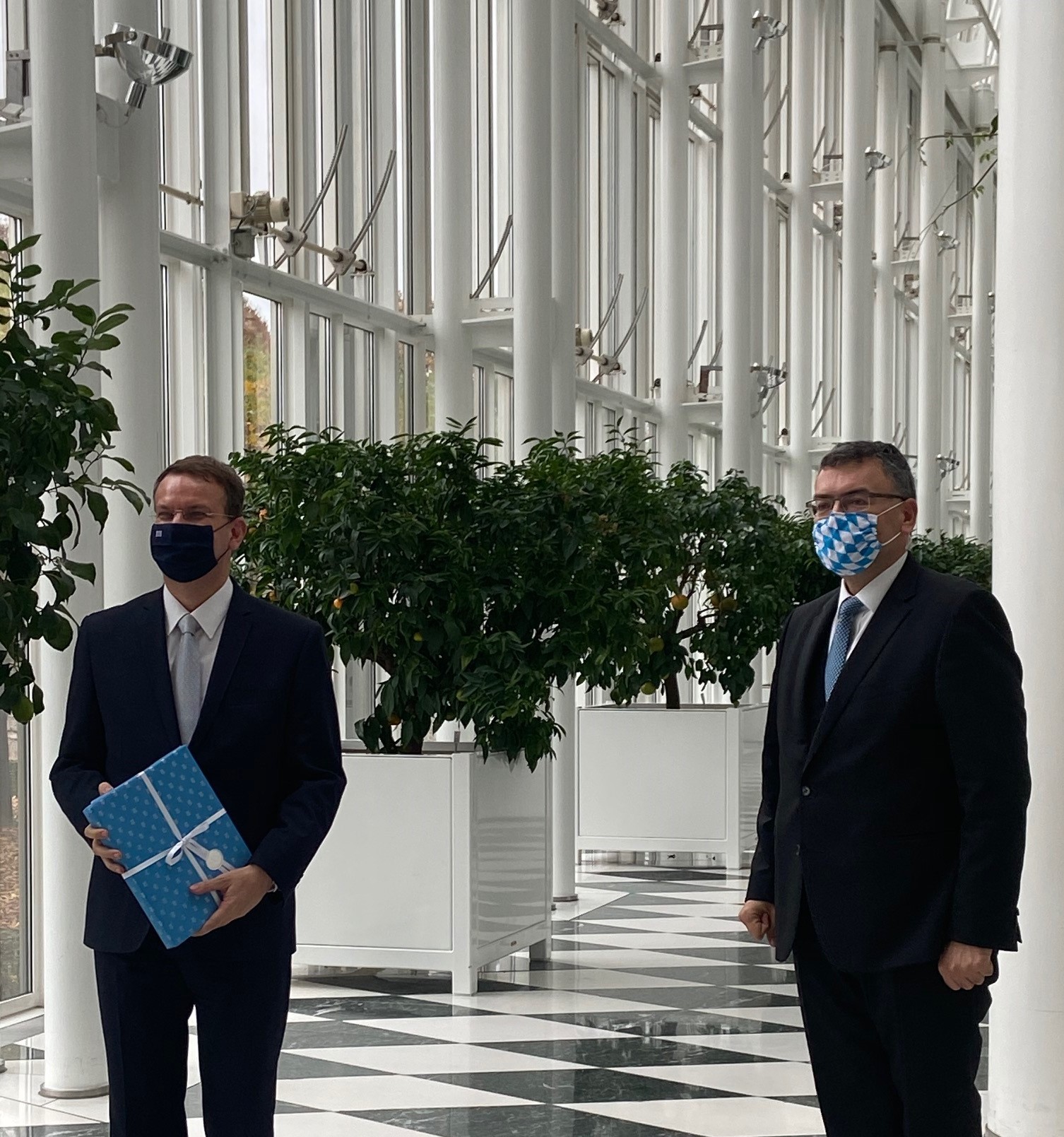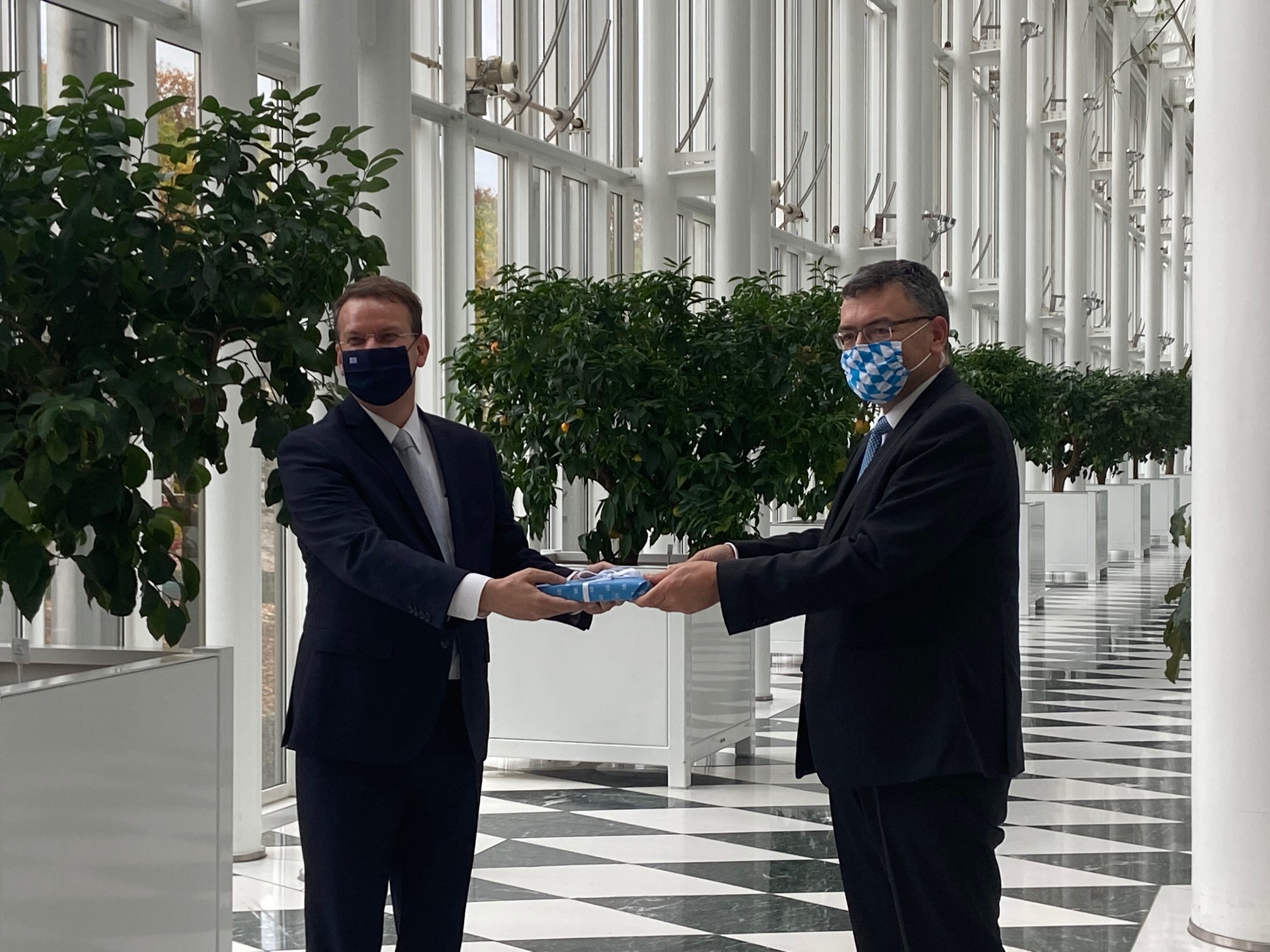 Treffen mit dem Leiter der Staatskanzlei, Staatsminister Dr. Florian Herrmann. Gespräche über griechisch-bayerische Zusammenarbeit und aktuelle außenpolitische und internationale Themen.