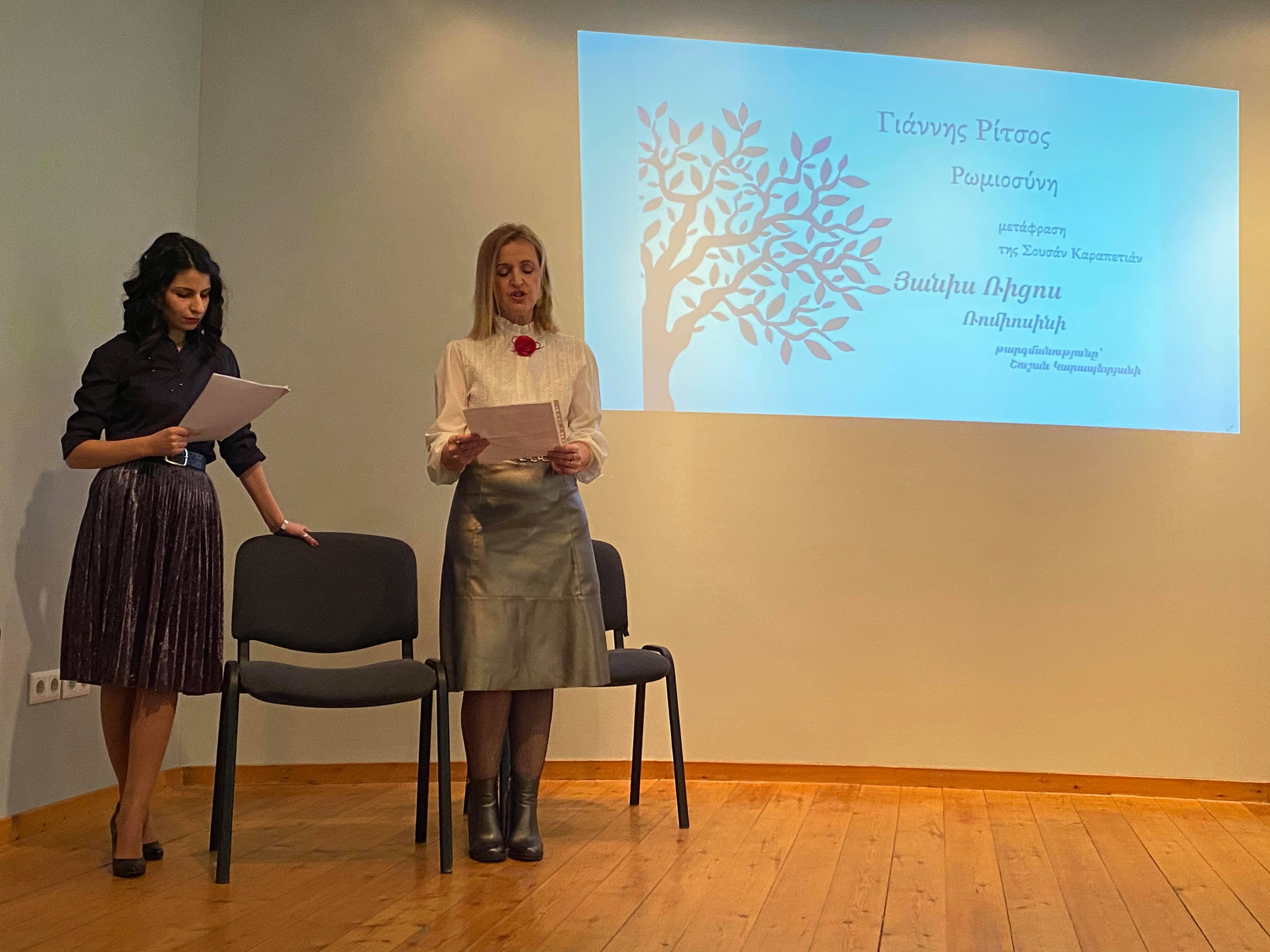 Eκδήλωση της Παγκόσμιας Ημέρας Ελληνικής Γλώσσας που διοργανώθηκε στο Ερεβάν της Αρμενίας από την Ένωση Ελληνικών Κοινοτήτων της Αρμενίας στις 9 Φεβρουαρίου 2020, υπό την αιγίδα της πρεσβείας μας. Η εκδήλωση πραγματοποιήθηκε σε αίθουσα του μουσείου του Αρμένιου ζωγράφου και καλλιτέχνη Μάρτυρος Σαριάν.