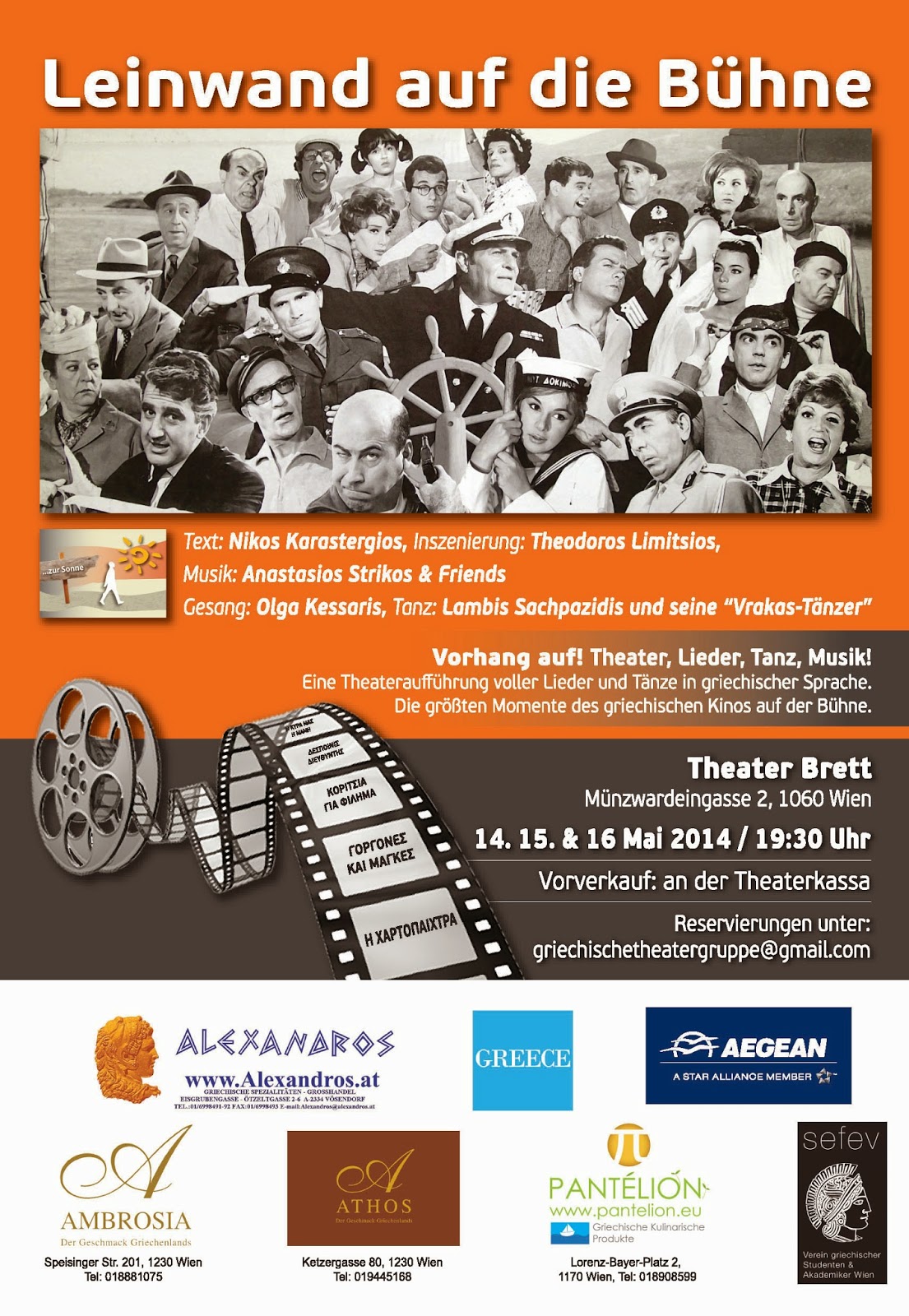 Αποσπάσματα από παλιές ελληνικές κωμωδίες ανεβαίνουν στο σανίδι! Όχι σε κάποιο θέατρο της Αθήνας ή της Θεσσαλονίκης, αλλά στη Βιέννη. Και μάλιστα από ερασιτέχνες ηθοποιούς. Η ελληνική θεατρική ομάδα «...προς τον ήλιο» σας προσκαλεί στη δεύτερη παράστασή της, στις 14, 15 και 16 Μαΐου 2014, στο θέατρο Brett, Münzwardeingasse 2, 1060, Βιέννη. «Από τη μεγάλη οθόνη στο Σανίδι: Μια θεατρική παράσταση γεμάτη τραγούδι και χορό στην ελληνική γλώσσα.