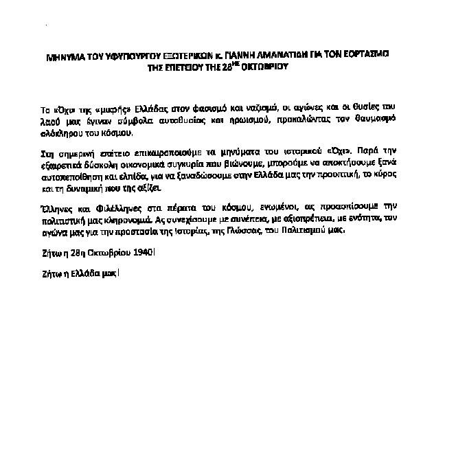 Μήνυμα του Υφυπουργού Εξωτερικών κ. Γιάννη Αμανατίδη για τον εορτασμό της επετείου της 28ης ΟκτωβρίουΜήνυμα του Υφυπουργού Εξωτερικών κ. Γιάννη Αμανατίδη για τον εορτασμό της επετείου της 28ης Οκτωβρίου