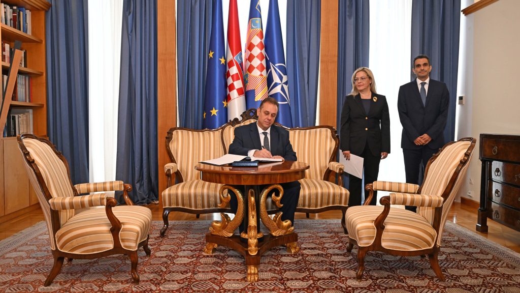 Ο νέος Πρέσβυς της Ελλάδος στο Ζάγκρεμπ, κ. Αθανάσιος Παρέσογλου, επέδωσε τα διαπιστευτήριά του στον Πρόεδρο της Δημοκρατίας της Κροατίας, κ. Zoran Milanović, σε ειδική τελετή στο Προεδρικό Μέγαρο, χθες Τετάρτη, 2 Οκτωβρίου 2024. Στην τελετή παρέστησαν η Πρεσβευτής-Σύμβουλος κα Έλενα Τριανταφύλλου και ο Σύμβουλος Οικονομικών και Εμπορικών Υποθέσεων της Πρεσβείας, κ. Μιχαήλ Χαροκόπος, ο Πρέσβυς κ. Neven Pelicarić, Σύμβουλος του Προέδρου της Δημοκρατίας της Κροατίας για Θέματα Εξωτερικής και Ευρωπαϊκής Πολιτικής, η κα Irena Alajbeg, Γενική Διευθύντρια του Κροατικού Υπουργείου Εξωτερικών για Οικονομικές Υποθέσεις και Αναπτυξιακή Συνεργασία, και ο κ. Ivan Mutavdžić, υπεύθυνος για Θέματα Εξωτερικής και Ευρωπαϊκής Πολιτικής στο Γραφείο του Προέδρου. Στην συνέχεια, ο κ. Παρέσογλου έγινε δεκτός από τον Πρόεδρο κ. Milanović, σε κατ’ ιδίαν συνάντηση, που διεξήχθη σε ιδιαίτερα εγκάρδια και θερμή ατμόσφαιρα.
