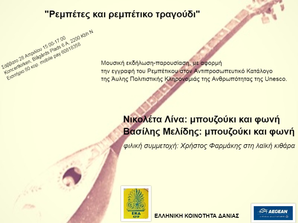 Η Ελληνική Κοινότητα Δανίας, διοργανώνει μουσική εκδήλωση-παρουσίαση, το Σάββατο 28 Απριλίου 15:00-17:00, με αφορμή την εγγραφή του Ρεμπέτικου στον Αντιπροσωπευτικό Κατάλογο της Άυλης Πολιτιστικής Κληρονομιάς της Ανθρωπότητας της Unesco.