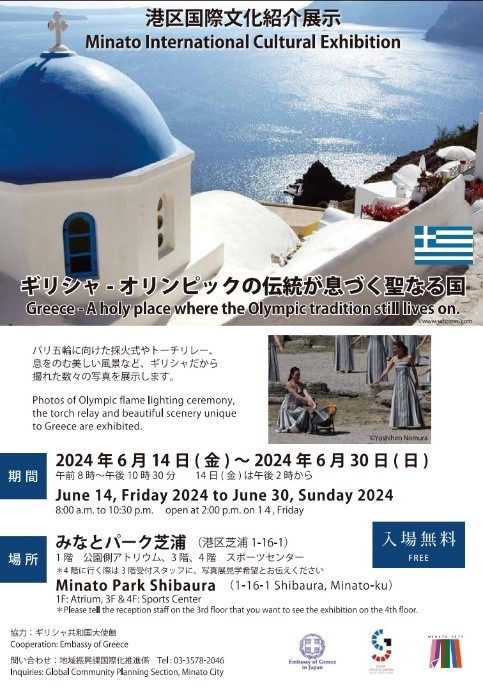 The Municipality of Minato in cooperation with the Embassy of Greece presented the photo exhibition of Mr. Yoshihiro Nomura “Greece – A holy place where the Olympic tradition still lives on”, at Minato Park Shibaura, from June 14 -30, 2024”. The photos included scenes from the Olympic flame lighting ceremony, the torch relay, and beautiful Greek scenery. Ambassador Argyros and his spouse Mrs. Gousta visited the exhibition on the Opening Day. The exhibition was part of the events for the 2024 Greece-Japan Year of Culture and Tourism.