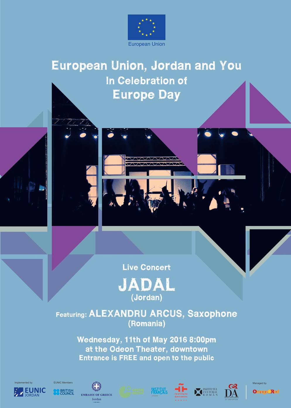 On Wednesday May 11th 2016 at 20.00, at the Odeon Theatre, a concert will be presented by the Jordanian musician Jadal, featuring Romanian saxophone player Alexandru Arcus.