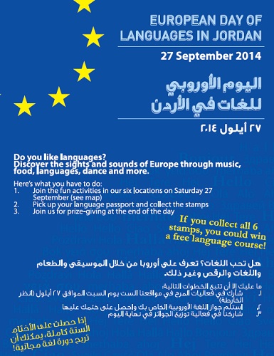 The European Day of Languages is celebrated in Jordan under the auspices of EUNIC (European Union National Institutes for Culture), on Saturday September 27, in various sites in Amman, (Greek Embassy/Greek Orthodox Church Hall Diodoros in Swefieh, Goethe Institute, Società Dante Alighieri, Instituto Cervantes, Institut Français, British Council).