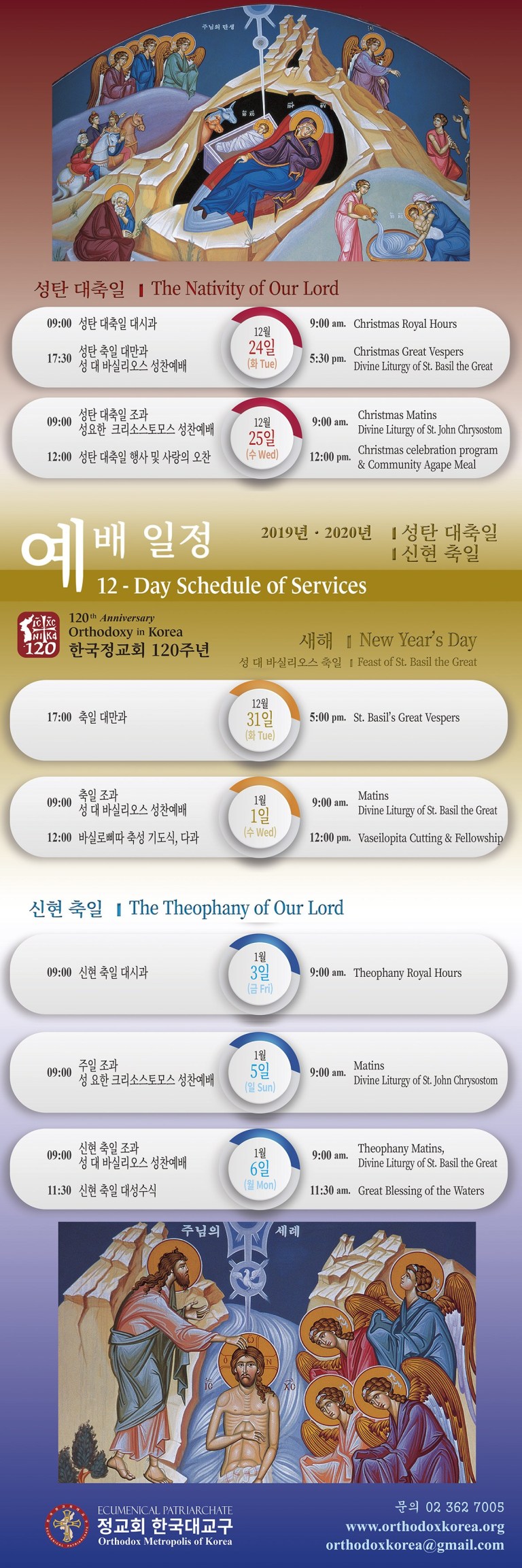 Schedule of Services on Christmas, New Year's Day and Theophany at the Orthodox Metropolis of Korea.