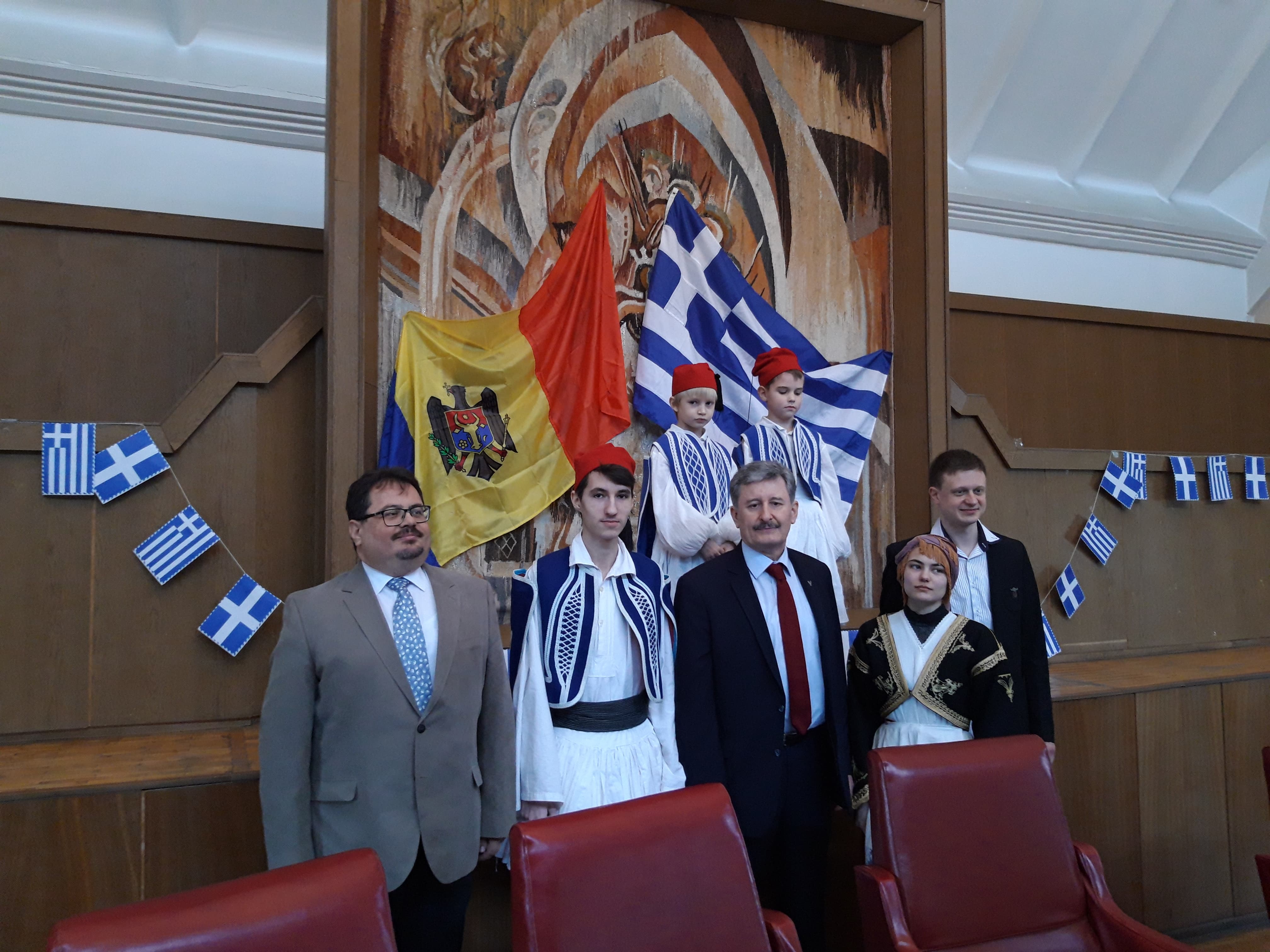 В конференц-зале, украшенном и оформленном тематическими плакатами и национальными флагами Греции и Молдовы, прозвучали специально подготовленные выступления председателя Греческой Общины в Молдове Владимира Яниева, преподавателя новогреческого языка Константины Кастани, активистов и друзей Греческой Диаспоры в Молдове, а также главы Миссии Евросоюза в Республике Молдова Петера Михалко.