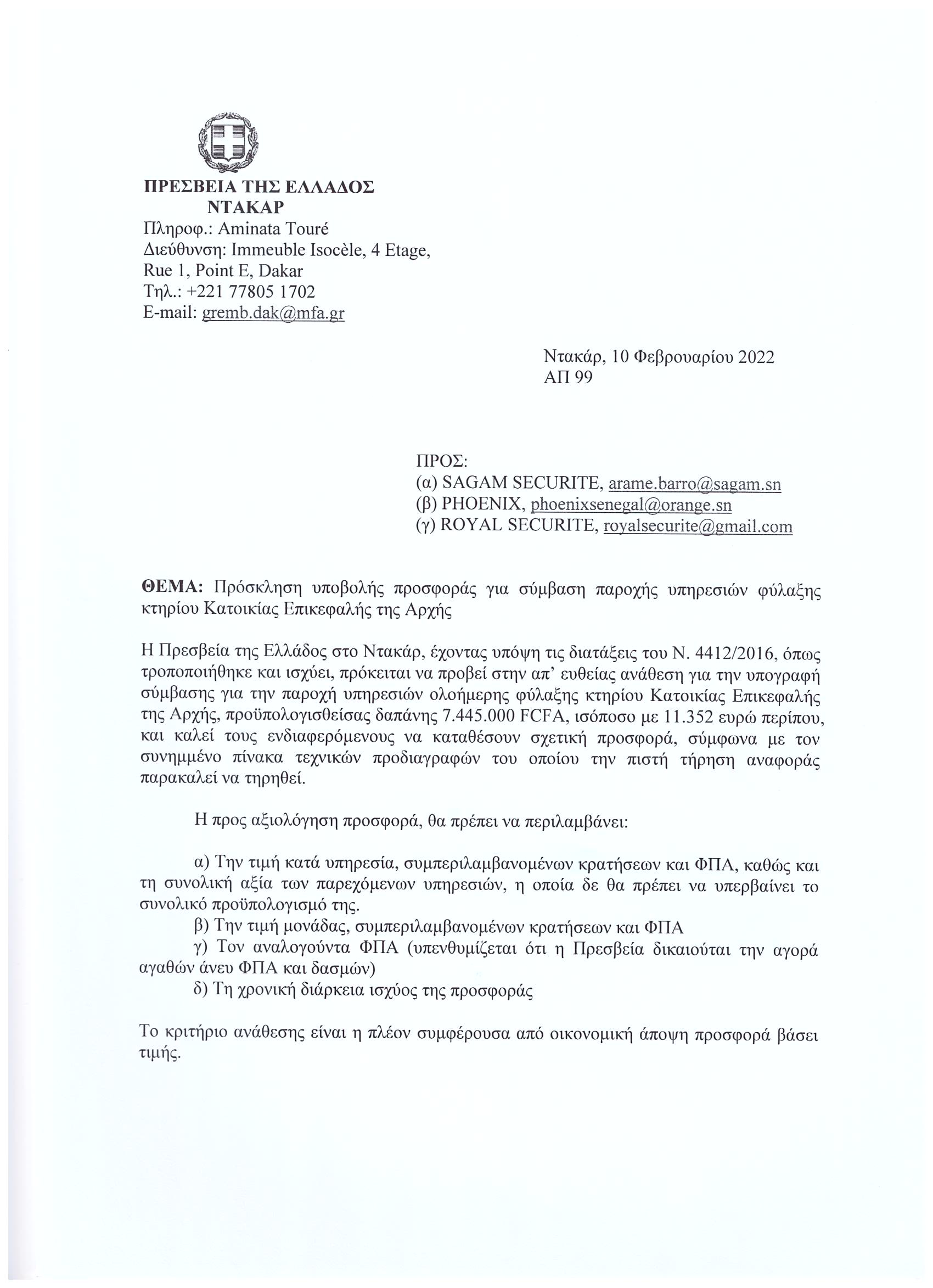 Appel d'offres pour Gardiannage Résidence Ambassadeur de Grèce à DakarAppel d'offres pour Gardiannage Résidence Ambassadeur de Grèce à Dakar
