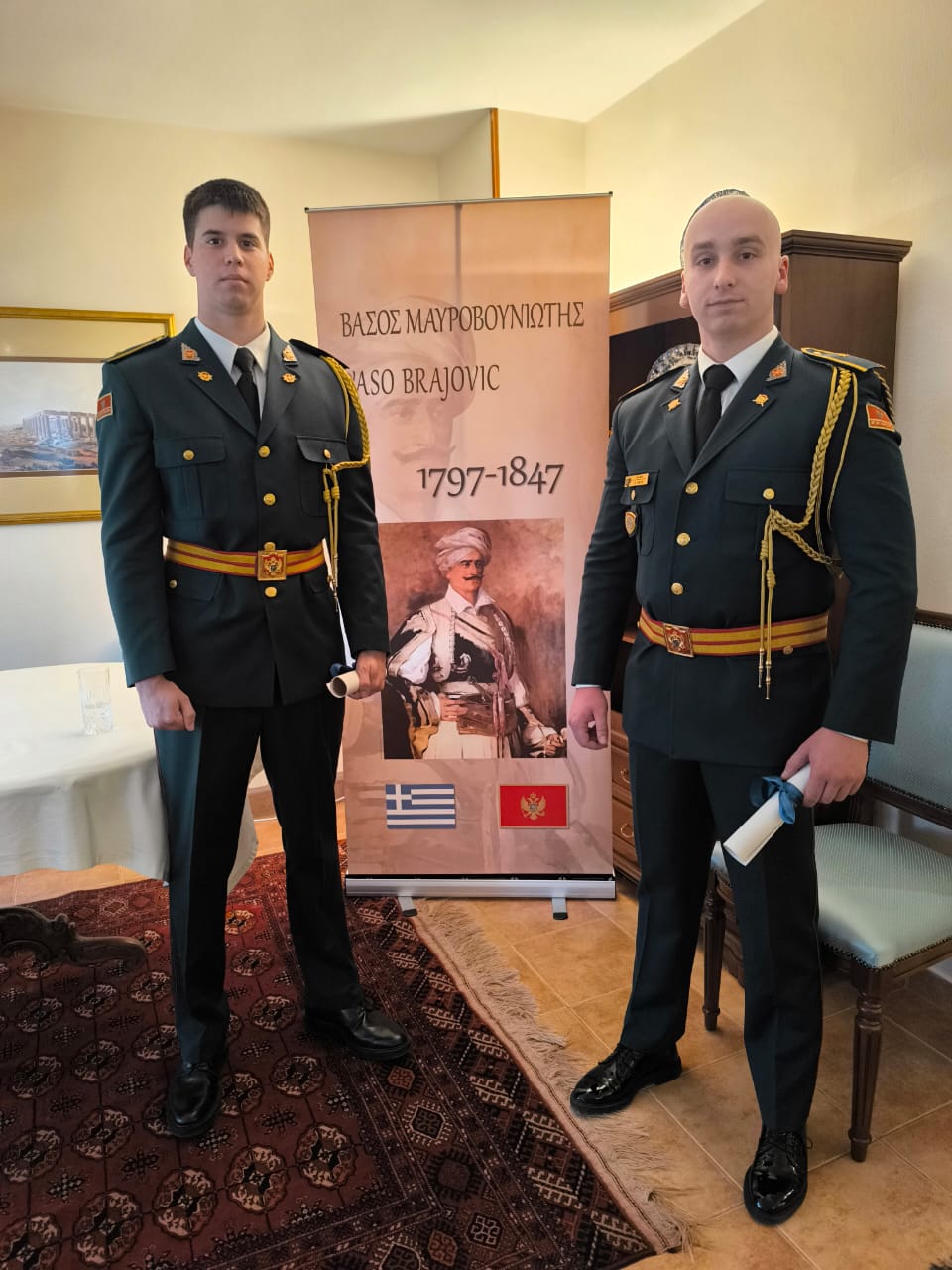 U Ambasadi Grčke u Podgorici, 03.04.2026, u prisustvu ambasadora Grčke g. Dimitrios Gioldasis-a, načelnika Generalštaba Vojske Crne Gore, brigadnog generala g. Miodraga Vuksanovića, državne sekretarke u Ministarstvu odbrane gđe Sandre Radević, kao i vojnog atašea Grčke u Beogradu, kapetana bojnog broda g. Evangelos-a Ekatommatis-a, predstavnika Ambasade i Ministarstva odbrane Crne Gore, nagrađena su dva oficira Vojske Crne Gore nagradom „Vasos Mavrovuniotis“ za izuzetne rezultate. Ovo priznanje predstavlja potvrdu visokog nivoa njihove obuke i posvećenosti, kao i snažnih veza povjerenja izgrađenih kroz zajedničke aktivnosti, vježbe i školovanje kadra na visokim vojnim obrazovnim institucijama u Grčkoj. Iskrene čestitke nagrađenima!