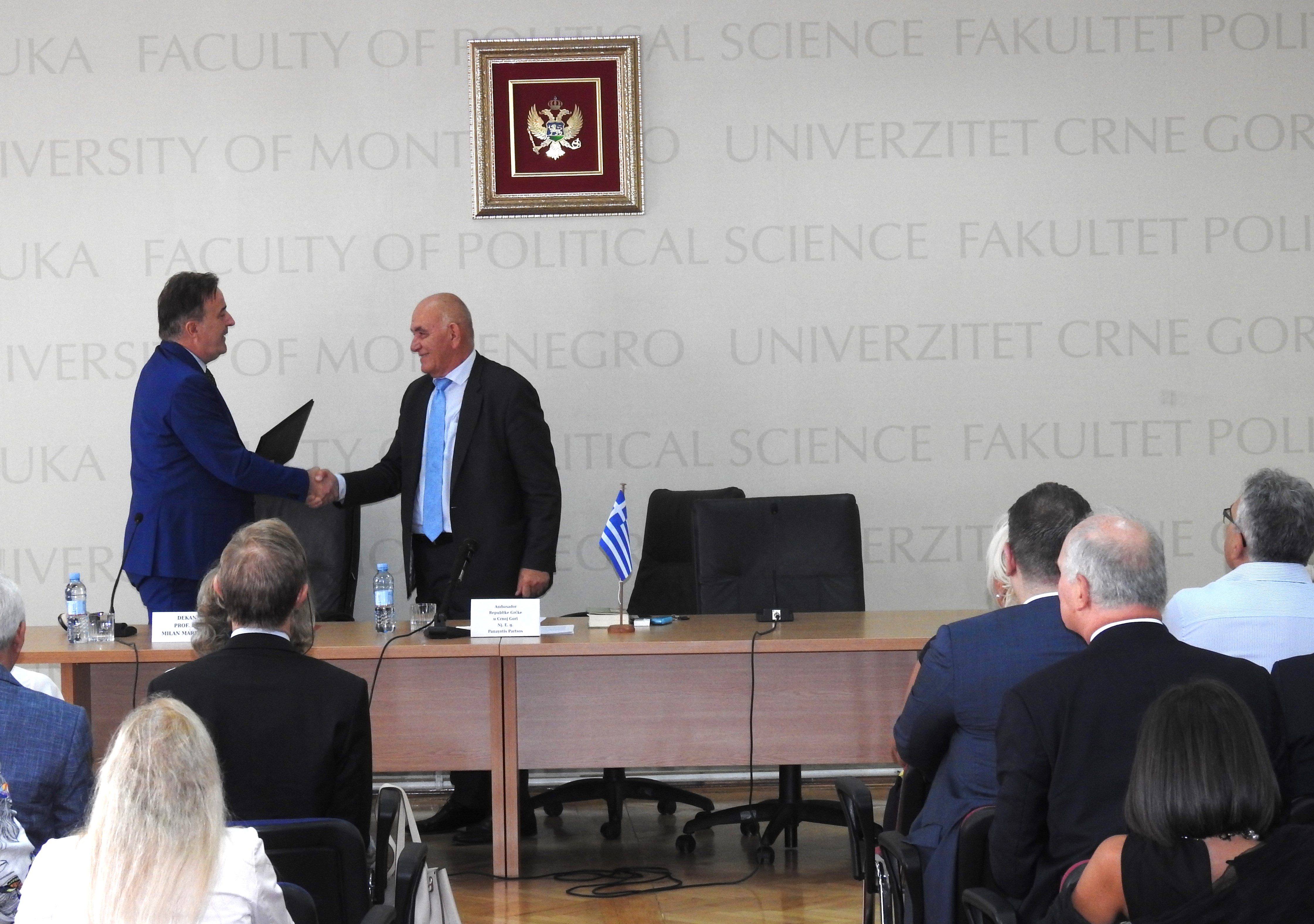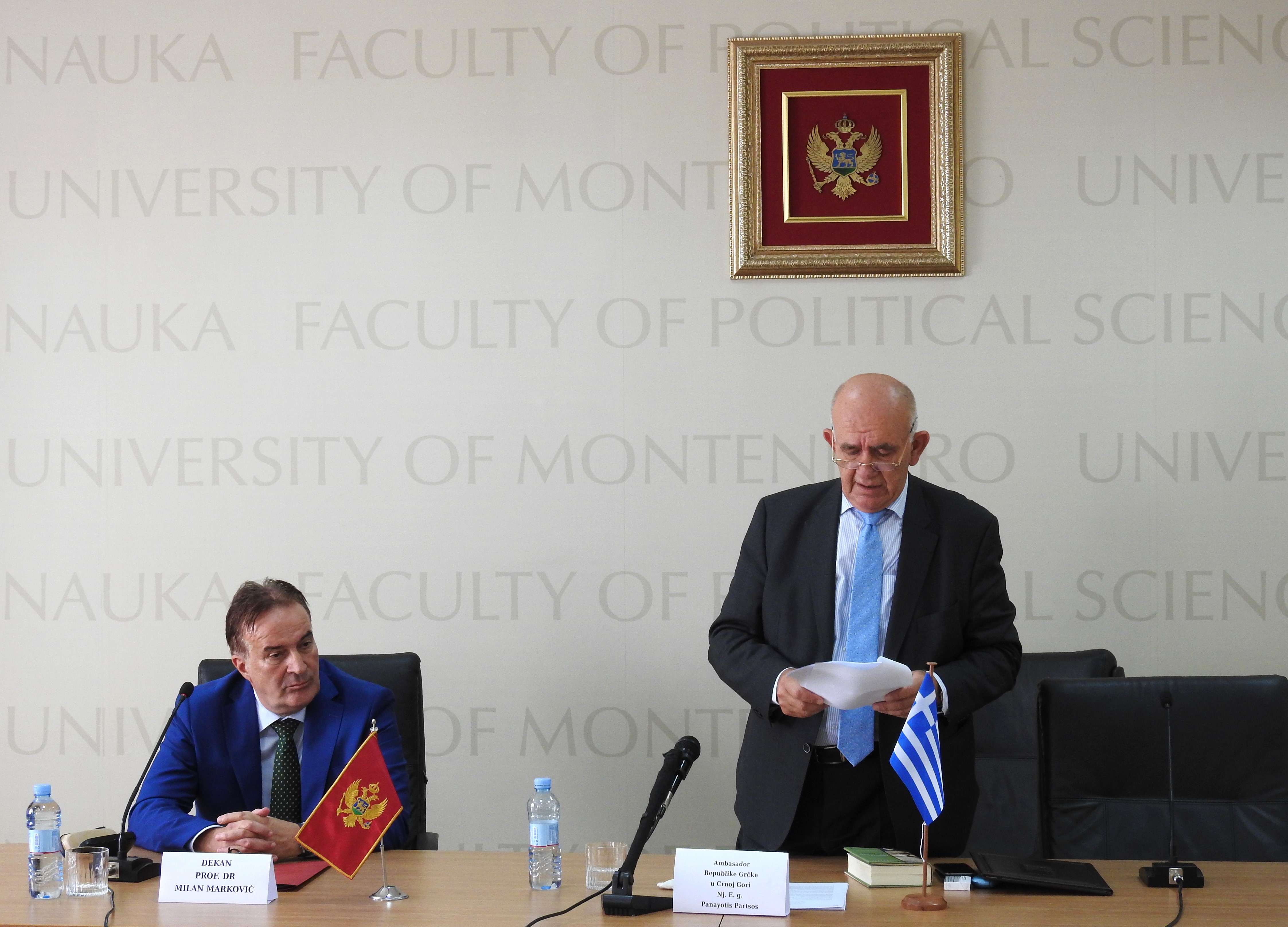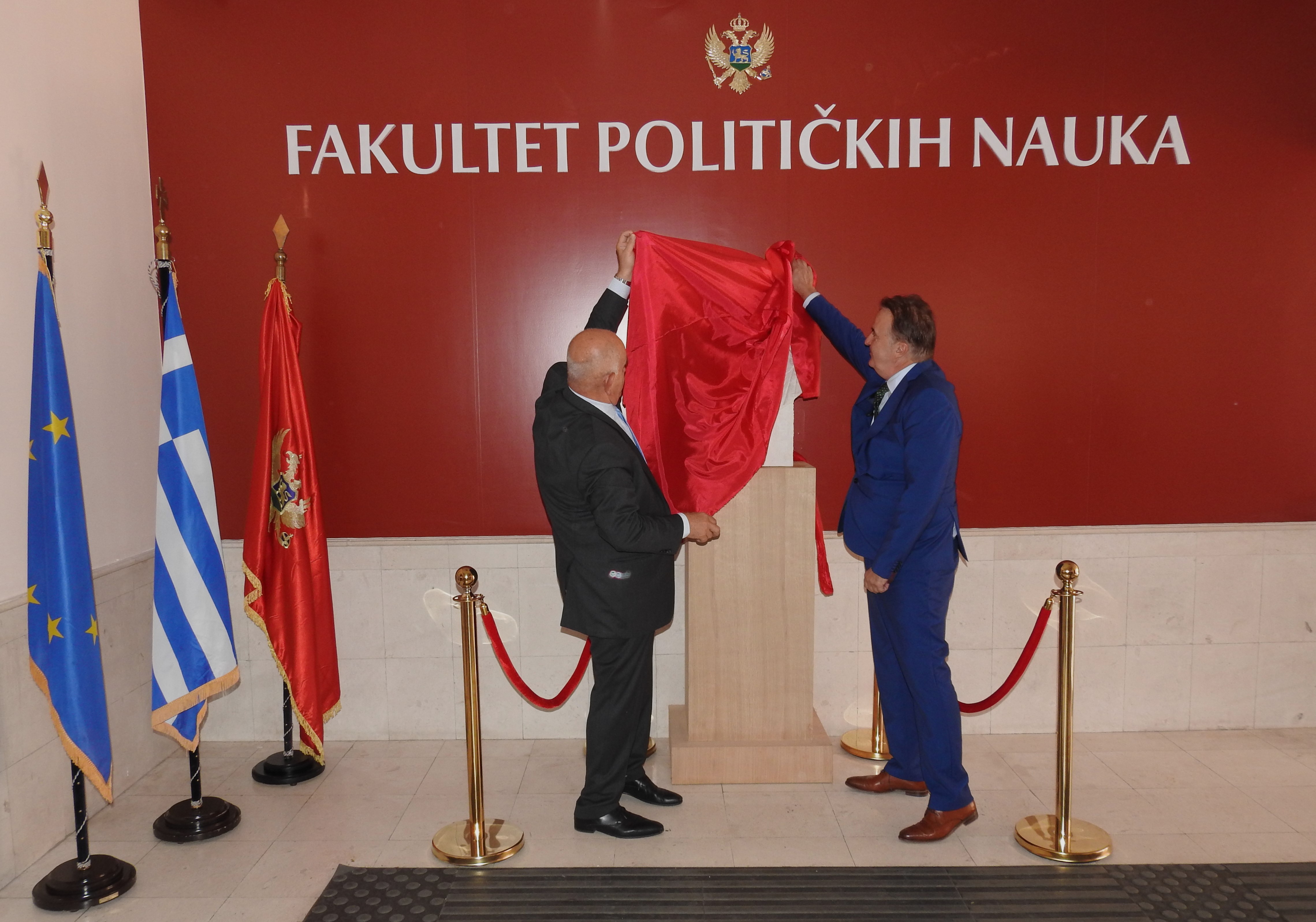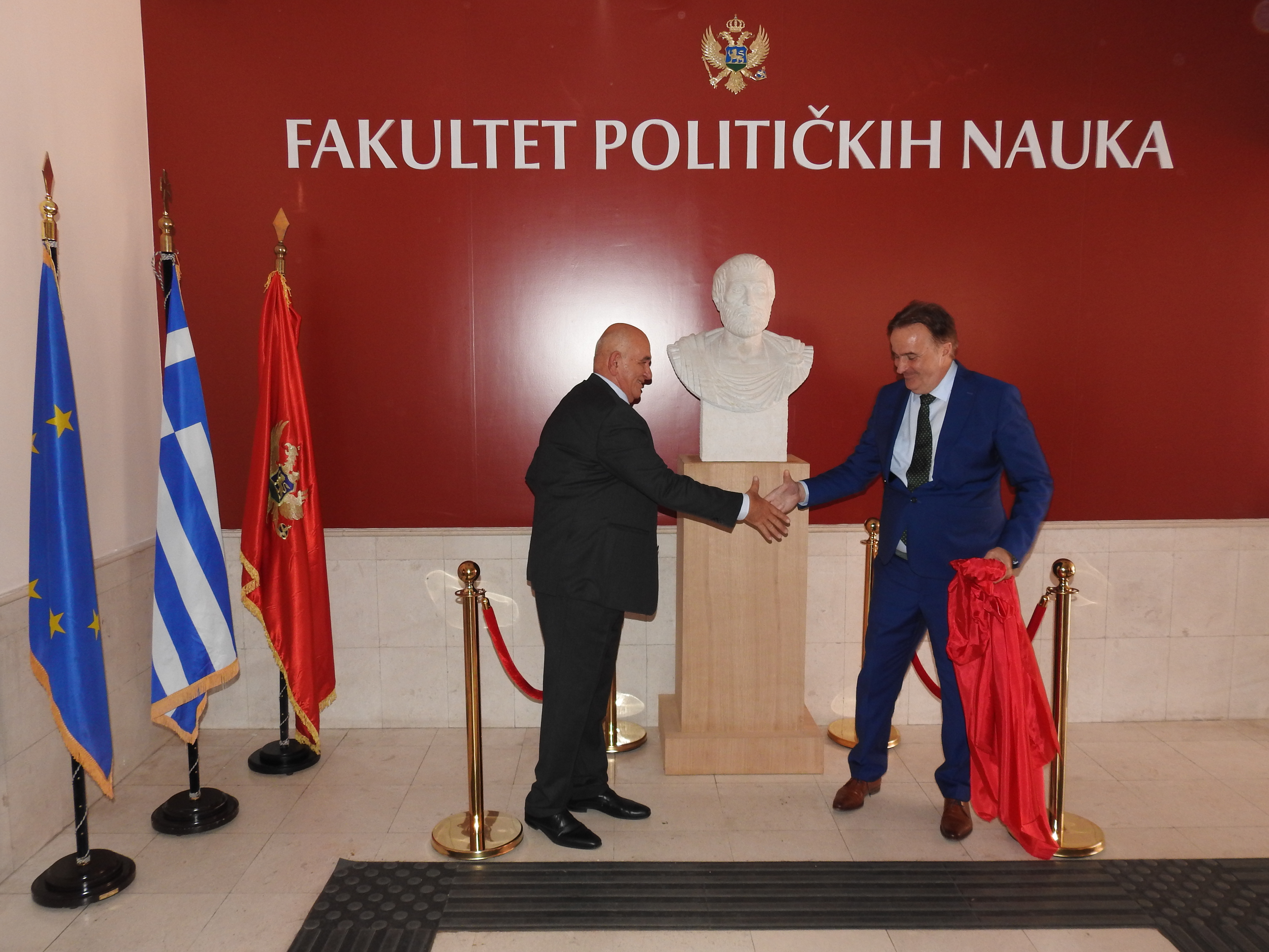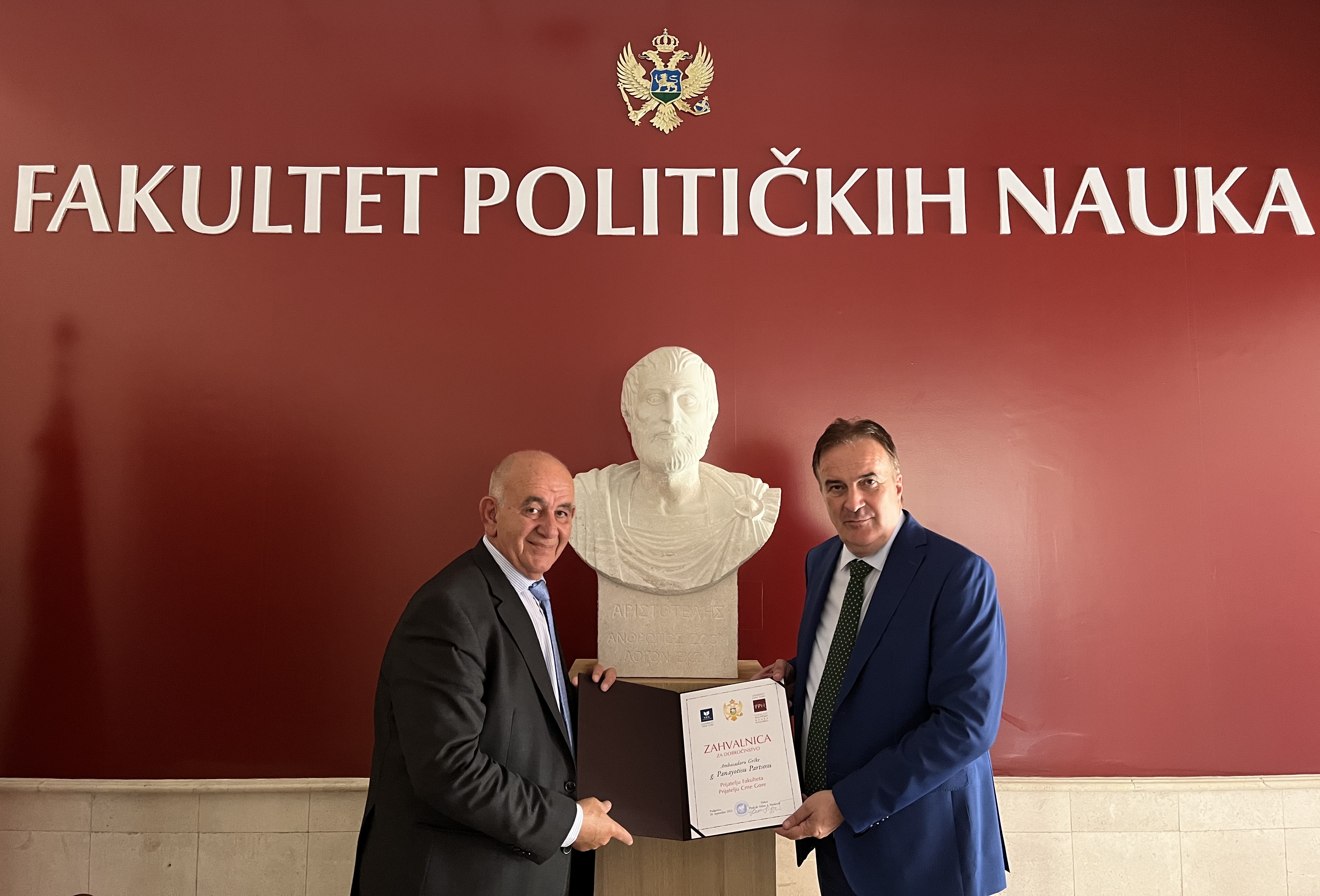 Juče, 20. septembra 2023. godine, održana je svečanost otkrivanja biste Aristotela u centralnom holu Fakulteta političkih nauka Univerziteta Crne Gore (UCG). Bistu su otkrili ambasador Grčke u Crnoj Gori, g-din Panayotis Partos, i dekan Fakulteta, prof.dr Milan Marković. Bista, koja je djelo umjetnika Branka Milanovića, je poklon Grčke ambasade, po donaciji Jugopetrola (Helenik Petroleum). U okviru svečanosti, ambasador g-din Partsos održao je predavanje o Aristotelovom životu, njegovom učenju i porukama savremenom dobu. Događaju su prisustvovali predstavnici Rektorata, Crnogorske akademije nauka i umjetnosti, predstavnici diplomatskog kora i studenti.