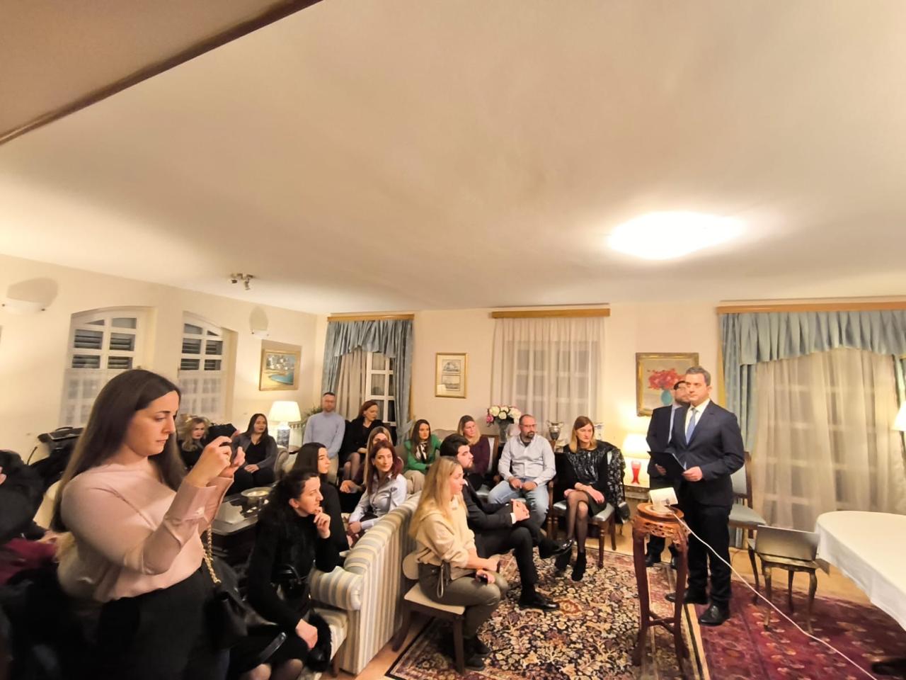 Εκδήλωση στην πρεσβευτική κατοικία, 9 Φεβρουαρίου, παρουσία μαθητών του ΤΕΓ Ποντγκόριτσα, επ’ ευκαιρία της Παγκόσμιας Ημέρας Ελληνικής Γλώσσας και της επίσημης καθιέρωσής της από την UNESCO, με παρουσίαση του μηνύματος του Υπουργού Εξωτερικών κ. Γιώργου Γεραπετρίτη και προβολή του βιντεοσκοπημένου μηνύματος του Υφυπουργού Εξωτερικών κ. Γιάννη Λοβέρδου.