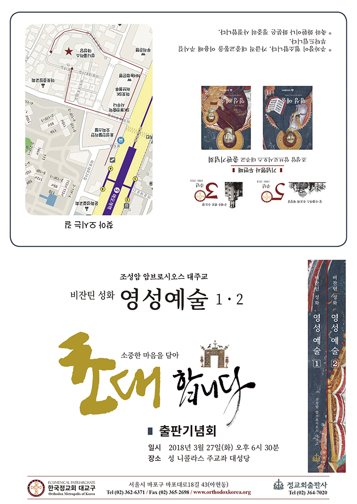 Την Τρίτη 27 Μαρτίου 2018 και ώρα 6:30 μ.μ. θα πραγματοποιηθεί στον Καθεδρικό Ναό του Αγίου Νικολάου Σεούλ η παρουσίαση του δίτομου έργου του Μητροπολίτου Κορέας π. Αμβροσίου: Ορθόδοξες εικόνες: ένας πολύτιμος πνευματικός θησαυρός. Το έργο εκδόθηκε από τον εκδοτικό οίκο της Ορθόδοξης Μητρόπολης Κορέας Korean Orthodox Editions. Εκτός της μεγάλης εισαγωγής περί της θεολογίας των εικόνων ερμηνεύονται θεολογικά και εικαστικά 52 εικόνες του Χριστού, της Θεοτόκου, καθώς επίσης Αγγέλων, Προφητών, Αποστόλων, Μαρτύρων, Οσίων και Αγίων. Σύνολο σελίδων 512.
