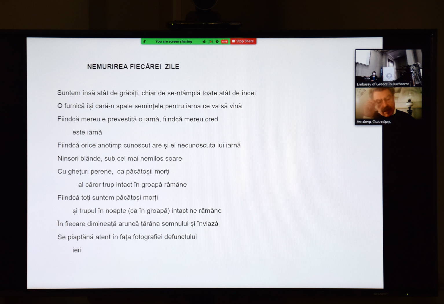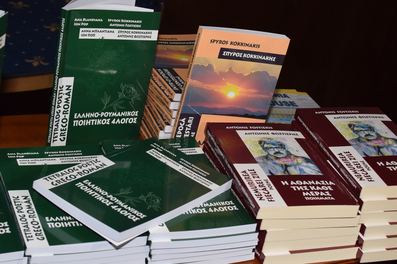 ην εκδήλωση χαιρέτησαν ο Πρόεδρος της Ρουμανικής Ακαδημίας, Ακαδημαϊκός κ. Ioan-Aurel Pop, η Πρέσβυς της Ελλάδας στη Ρουμανία κ. Σοφία Γραμματά, ο Γενικός Γραμματέας Απόδημου Ελληνισμού και Δημόσιας Διπλωματίας της Ελλάδας κ. Ιωάννης Χρυσουλάκης, και ο Πρόεδρος της Ένωσης Ελλήνων Ρουμανίας, βουλευτής κ. Dragos Zisopol. Η εκδήλωση ήταν αφιερωμένη στην ποίηση. Διάβασαν ποιήματά τους οι ποιητές Ana Blandiana, Ion Pop, Σπύρος Κοκκινάκης και Αντώνης Φωστιέρης και ήταν άριστες οι μεταφράσεις τους από την κ. Elena Lazăr και την κ. Edith-Adriana Uncu. Ο Καθηγητής, επικεφαλής του Τομέα Νεοελληνικών Σπουδών του Πανεπιστημίου Βουκουρεστίου κ. Tudor Dinu μίλησε για το θέμα «Ο ελληνο-ρουμανικός λογοτεχνικός διάλογος ή η ανανέωση μιας παλαιάς παράδοσης». Παρουσιάστηκε επίσης δίγλωσσο βιβλίο με ποιήματα των τεσσάρων ποιητών, ο «Ελληνο-ρουμανικός ποιητικός 4λογος», που μόλις εκδόθηκε από τις εκδόσεις ΟΜΟΝΟΙΑ (κ. Elena Lazăr), με την ευγενή συνεισφορά του Διμερούς Ελληνο-ρουμανικού Επιμελητηρίου. Στις 8.2, οι κύριοι Blandiana, Pop και Κοκκινάκης μας πρόσφεραν την τιμή και την χαρά μιας επίσκεψης στην Ελληνική Πρεσβεία.