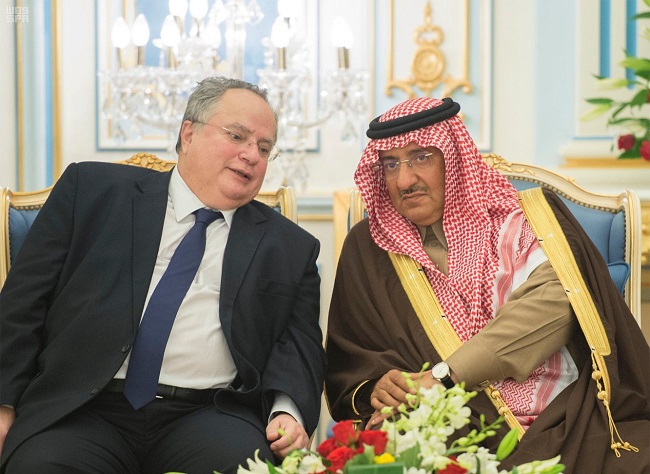 Στην φωτογραφία ο Υπουργός Εξωτερικών Νίκος Κοτζιάς, με τον Διάδοχο του Σαουδαραβικού θρόνου Αναπληρωτή Πρωθυπουργό και Υπουργό Εσωτερικών Πρίγκιπα Mohammedbin Naïfbin Abdulaziz Al Saud.