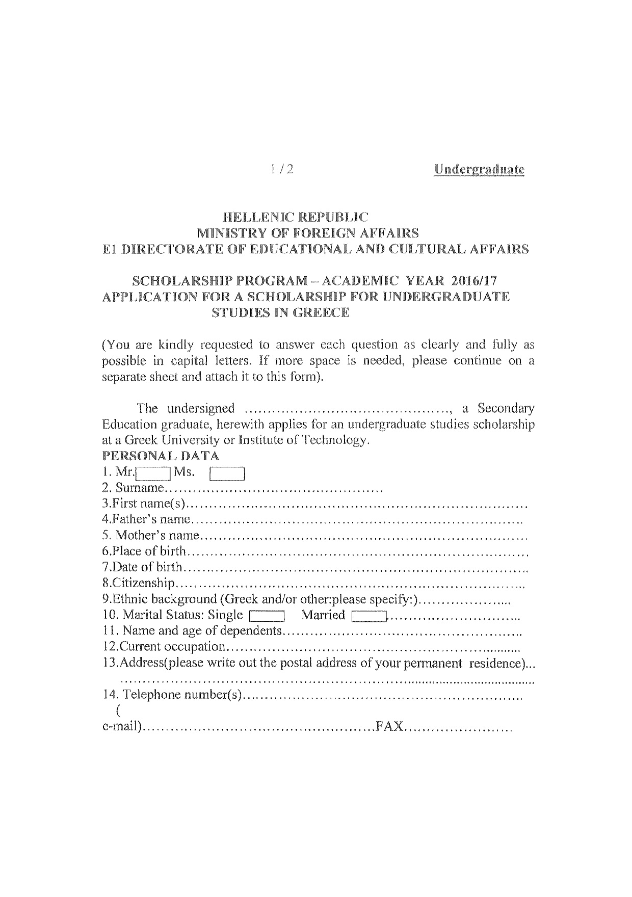 Η Πρεσβεία της Ελλάδος στο Βελιγράδι ενημερώνει τους ενδιαφερόμενους ότι η Διεύθυνση Μορφωτικών και Πολιτιστικών Υποθέσεων του Υπουργείου Εξωτερικών της Ελληνικής Δημοκρατίας προκηρύσσει για το ακαδημαϊκό έτος 2016-2017 τη χορήγηση υποτροφιών για προπτυχιακές ή μεταπτυχιακές σπουδές σε ελληνικά Α.Ε.Ι. και Τ.Ε.Ι.