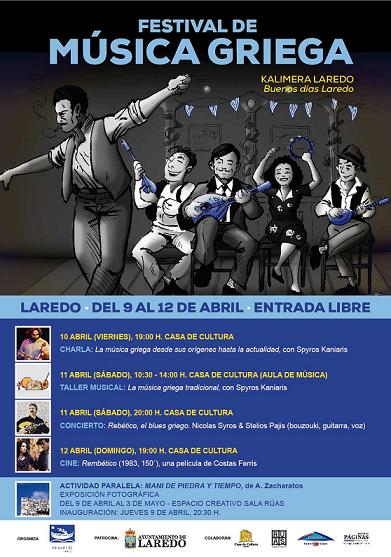 La Asociación Sociocultural Filohelena “Periplo”, con el patrocinio del Ayuntamiento de Laredo, organiza Kalimera Laredo (Buenos días Laredo), un festival innovador que pretende acercarnos a la música griega tradicional a través de un programa de actividades amenas y variadas. Durante cuatro días tendremos la oportunidad de conocer la música del país heleno desde sus orígenes hasta nuestros días. Se dará especial énfasis al rebético, la música popular urbana cuyos orígenes datan de finales del siglo XIX, compartiendo similitudes con géneros como el blues, el tango argentino, el fado o el flamenco. El festival, que tendrá lugar del 9 al 12 de abril, se compone de una charla, un taller musical, un concierto de rebético y la proyección de la película Rebetico de C. Ferris. Al mismo tiempo, como una actividad paralela que viene a complementar el programa, se ofrecerá una exposición que nos transportará hasta el Peloponeso a través de la mirada del reconocido fotógrafo griego Andreas Zacharatos. Se trata de una propuesta original de la que pueden disfrutar todos los públicos.