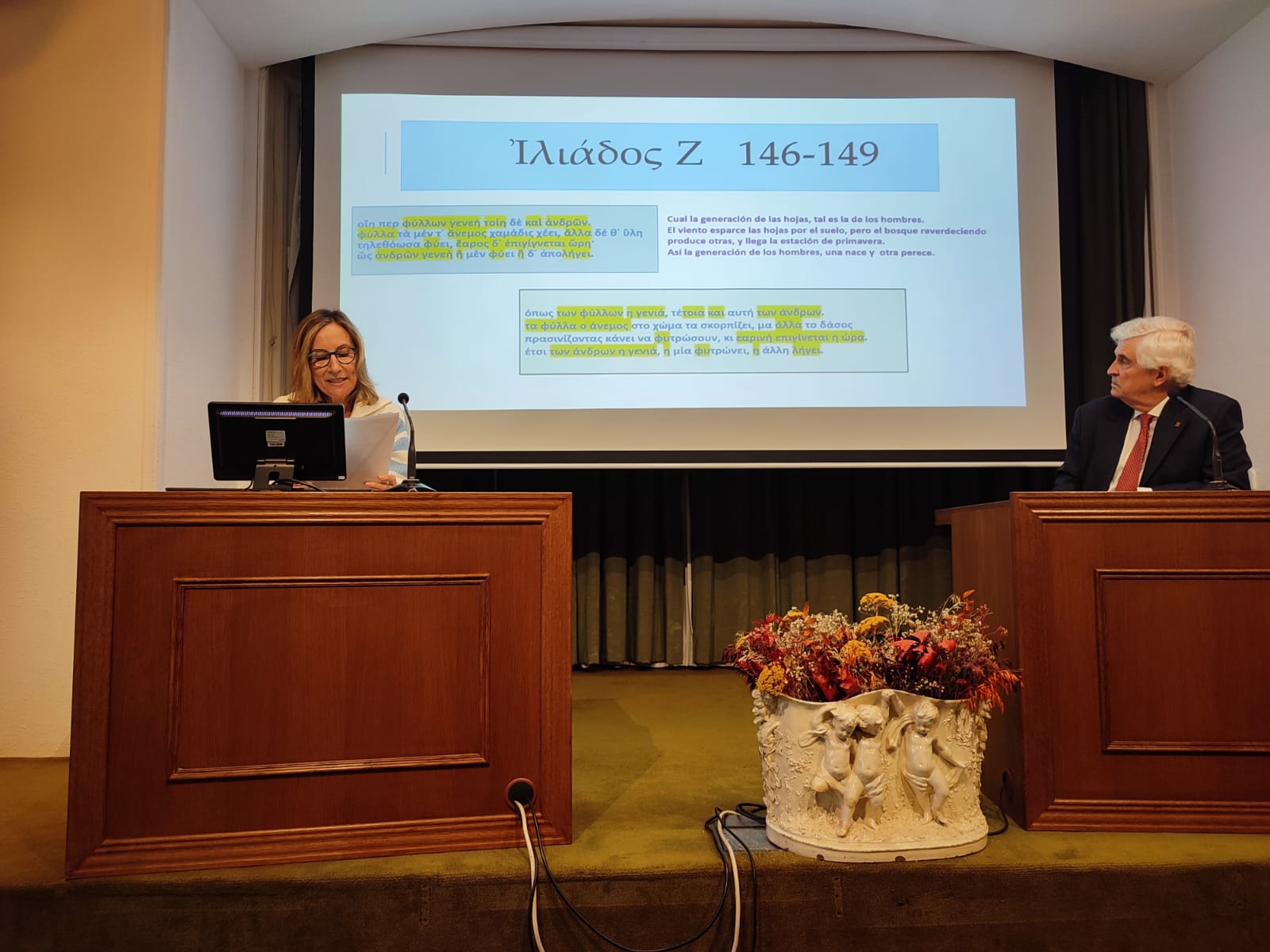 Ακολούθησε διάλεξη με τίτλο «Λεξική παράδοση της ελληνικής γλώσσας. Μια φευγαλέα συνάντηση με τον Όμηρο», της ελληνίστριας, María Dolores Reche Martínez, καθηγήτριας στο Λύκειο Carlos III του Τολέδου, η οποία μέσω συγκεκριμένων λεξικών παραδειγμάτων ανέλυσε τη διαχρονικότητα του ελληνικού λεξιλογίου και την επιρροή του στην ισπανική γλώσσα. Στη συνέχεια, ο Dr. D. Juan Cañada Vicinay, σπoυδαστής της ελληνικής γλώσσας, στην εισήγησή του με τίτλο «Η ελληνική γλώσσα και η διερμηνεία της στην κοινότητα» ανέδειξε, μέσα από προσωπικές του εμπειρίες, τη μεγάλη μεταμορφωτική επίδραση που είχε η ελληνική γλώσσα στην νεωτερική σκέψη και λογική.