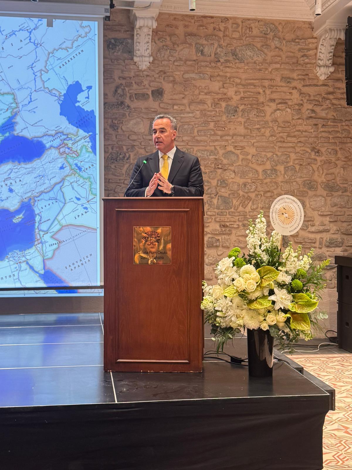 Καλωσορίζοντας τους πολυπληθείς προσκεκλημένους, ο Πρέσβης κ. Κωνσταντίνος Κούτρας, Γενικός Πρόξενος της Ελλάδας στην Κωνσταντινούπολη, υπογράμμισε τη σημασία της παγκόσμιας αναγνώρισης της ελληνικής γλώσσας όπως αποτυπώθηκε στην απόφαση της Γενικής Διάσκεψης της UNESCO. Τόνισε δε, ότι η αναγνώριση αυτή αποτελεί έμπρακτη επιβεβαίωση της ανεκτίμητης συμβολής του ελληνικού στοιχείου στην παγκόσμια ιστορία, την πολιτιστική κληρονομιά και τη διαμόρφωση της εθνικής ταυτότητας, καθώς και στην προώθηση του διαπολιτισμικού διαλόγου και της κατανόησης μεταξύ των λαών. Έκανε δε ιδιαίτερη μνεία στην προσφορά των Εκπαιδευτικών Ιδρυμάτων της Ομογένειας, στην Κωνσταντινούπολη και στην Ίμβρο, ευχόμενος την επαναλειτουργία της «πολύτιμης», όπως χαρακτηριστικά επισήμανε, Θεολογικής Σχολής της Χάλκης, ενώ δεν παρέλειψε να ευχαριστήσει το σύνολο των εκπαιδευτικών που εργάζονται στα ομογενειακά σχολεία για την ουσιαστική προσφορά τους στα Γράμματα και την Παιδεία του Γένους.