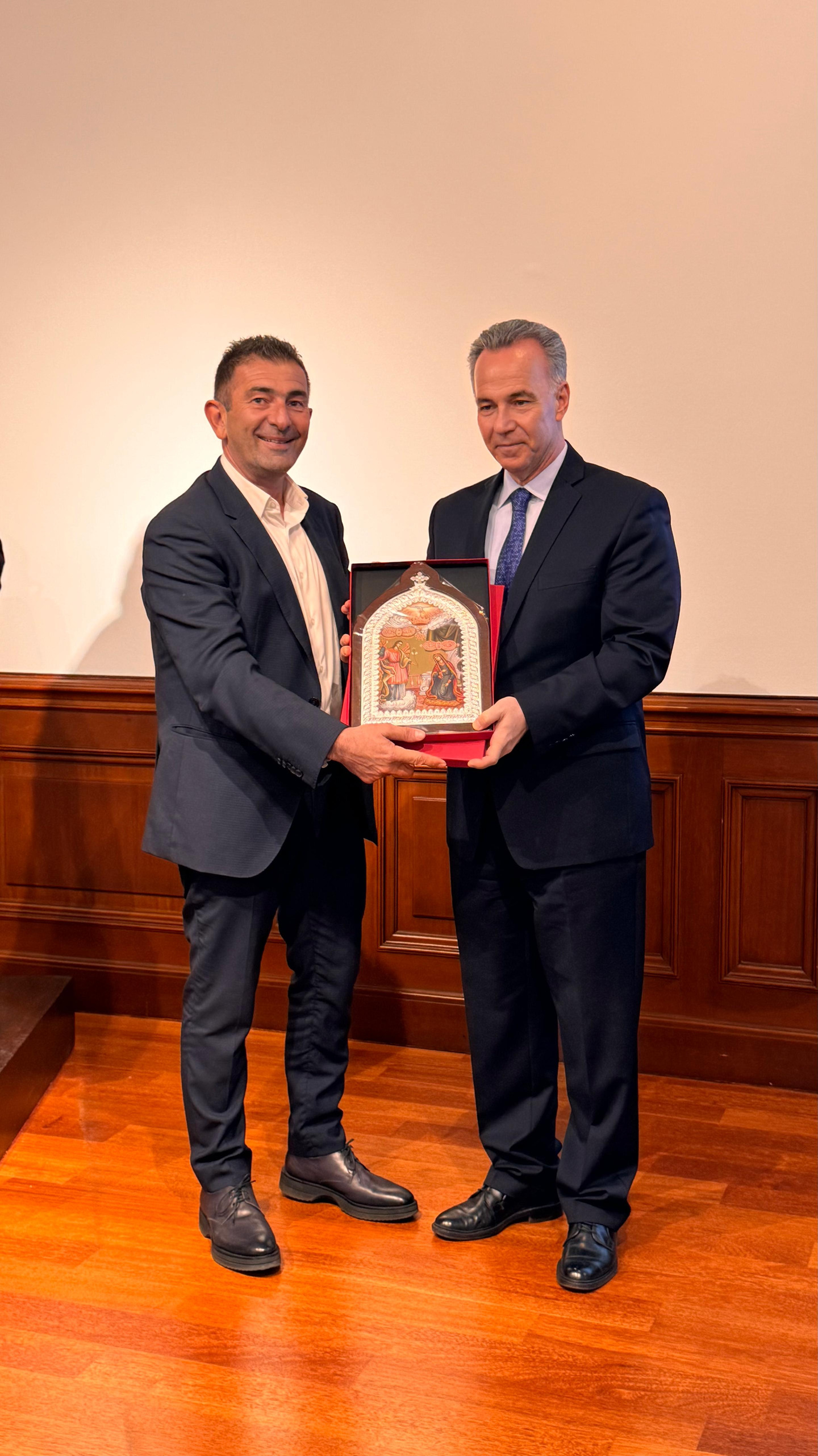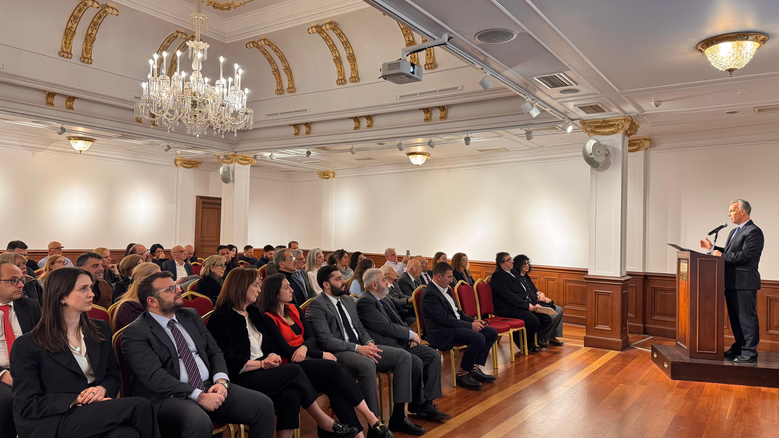 Καλωσορίζοντας τους εκλεκτούς προσκεκλημένους στο Σισμανόγλειο Μέγαρο, ο πρέσβης κ. Κωνσταντίνος Κούτρας, Γενικός Πρόξενος της Ελλάδας στην Κωνσταντινούπολη, αναφέρθηκε στη σημαντική ιστορική παρουσία των Ελλήνων στην Κωνσταντινούπολη, η οποία ενισχύθηκε ιδιαίτερα τον 19ο αιώνα από κύματα εγκατάστασης πληθυσμών από διάφορες περιοχές του ελληνικού χώρου. Ιδιαίτερη μνεία έκανε στους Τηνιακούς, οι οποίοι άφησαν το δικό τους ξεχωριστό αποτύπωμα στην Πόλη, κυρίως μέσα από την τέχνη της μαρμαρογλυπτικής αλλά και την επιχειρηματική τους δραστηριότητα, με χαρακτηριστικά δείγματα έργων τους στο ελληνορθόδοξο νεκροταφείο του Σισλί. Τόνισε, επίσης, ότι η συμβολή τους αποτελεί ένα σημαντικό και συχνά παραγνωρισμένο κεφάλαιο της ιστορίας του Ελληνισμού της Κωνσταντινούπολης, υπογραμμίζοντας πως το αποτύπωμα της ελληνικής παρουσίας στην Πόλη παραμένει ορατό μέχρι και σήμερα.