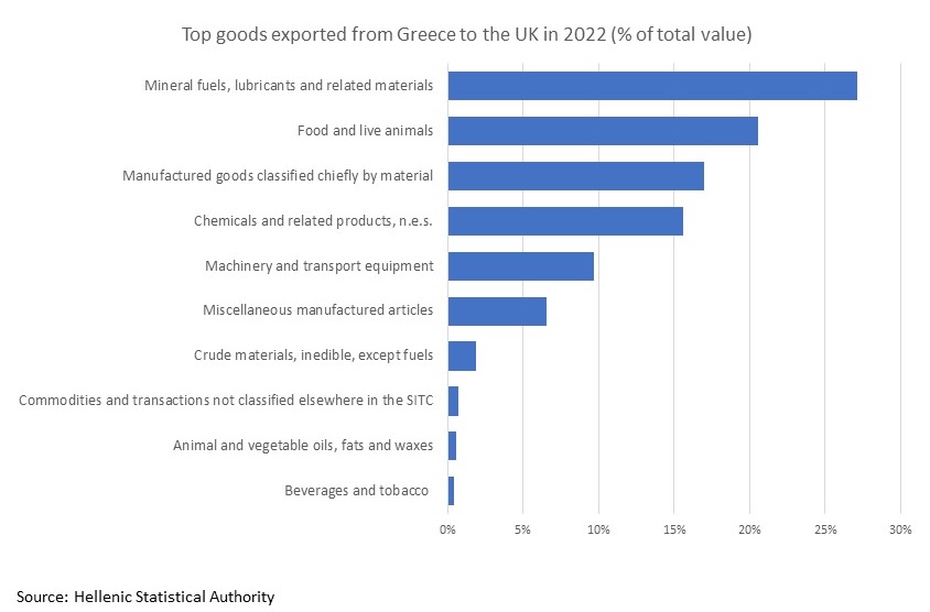 The main goods exported from Greece to the UK in 2022 were mineral fuels, lubricants and related materials, food (mainly dairy products), manufactured goods classified chiefly by material, and chemicals (mainly pharmaceuticals). Imports from the UK included various machines and devices, cars and alcoholic beverages.