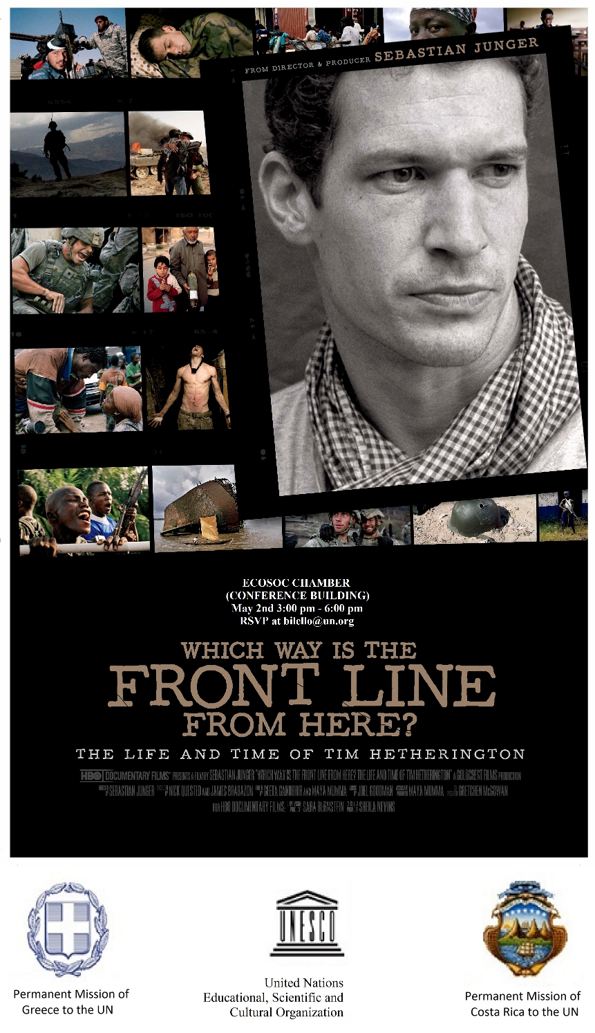 Με αφορμή την Παγκόσμια Ημέρα Ελευθερίας του Τύπου του 2013, οι Μόνιμες Αντιπροσωπείες της Κόστα Ρίκα και της Ελλάδας στα ΗΕ, σε συνεργασία με την UNESCO, διοργανώνουν την προβολή της ταινίας με τίτλο «Which way is the Front Line from Here? The Life and Time of Tim Hetherington», μια παραγωγή του Sebastian Junger. Η ταινία ήταν επίσημη επιλογή για το φεστιβάλ κινηματογράφου Sundance 2013. Την προβολή της ταινίας θα ακολουθήσει συζήτηση, με σκοπό την ευαισθητοποίηση και ενημέρωση σχετικά με το Πλάνο Δράσης των ΗΕ για την Ασφάλεια των Δημοσιογράφων και το θέμα της ατιμωρησίας.