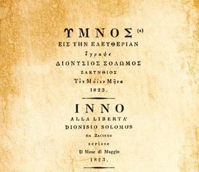 The Hymn to Liberty (or Hymn to Freedom) is a poem written by Dionysios Solomos (1823) and consists of 158 stanzas. It was set to music by Nikolaos Mantzaros, (1865) and it is the longest national anthem in the world by length of text. This anthem is being performed at every closing ceremony of the Olympic Games, to pay tribute to Greece as the birthplace of the ancient Olympics.