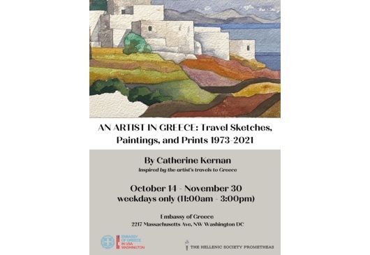 WASHINGTON, D.C. — The Embassy of Greece in the U.S. is pleased to present Catherine Kernan’s exhibition “AN ARTIST IN GREECE: Travel Sketches, Paintings, and Prints 1973-2021,” a visual diary of the artist’s experiences in Greece.