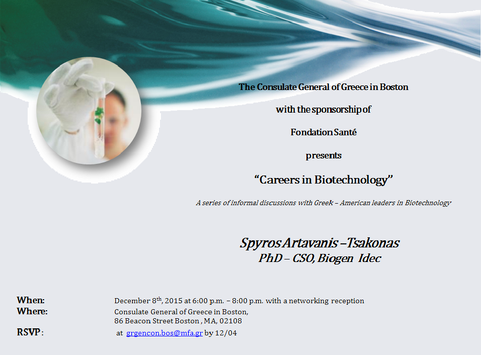 The Consulate General of Greece in Boston is hosting a series of informal and interactive discussions with Greek-American leaders in Biotechnology. Students, Research Fellows, Postdocs and young professionals are cordially invited to join us on Tuesday, December 8th, 2015 to a presentation by Spyros Artavanis-Tsakonas, PhD-CSO, Biogen Idec.