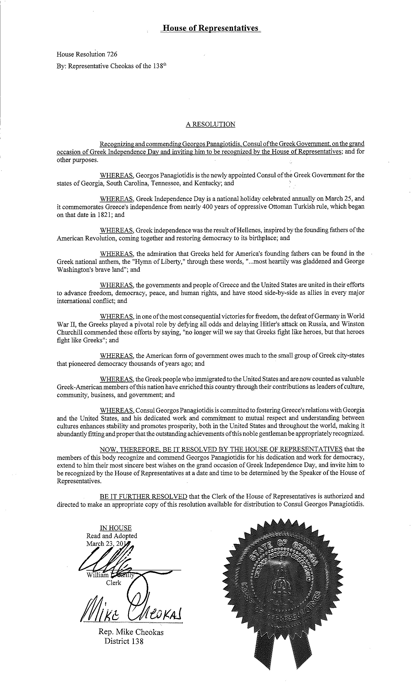 On the occasion of our Independence day, March 25, the President of the House of Representatives of the state of Georgia, invited the Consul of Greece, Mr. Georgios Panagiotidis, the Honourary Consul of Cyprus Ms Poly Potter, members of the Consulate and the Greek community of Atlanta to be present for the voting in of the resolution of the House of Representatives HR 726, in honour of our National Independence day.