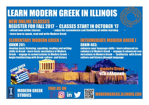 The Program of Modern Greek Studies at the University of Illinois at Urbana-Champaign will be offering two intensive Modern Greek Language online classes this coming Fall 2017.
