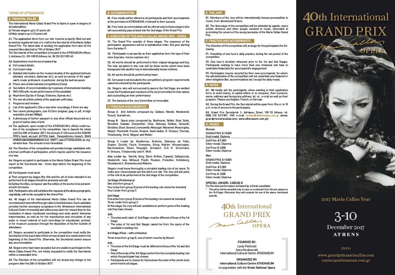 The 40th International Maria Callas Grand Prix in Opera will be held from the 3rd until the 10th of December 2017. For more information visit, http://www.grandprixmariacallas.com/en