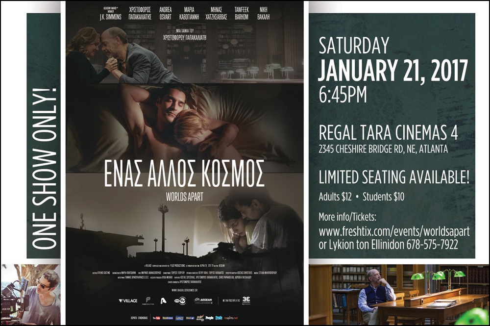 Με πρωτοβουλία του Λυκείου Ελληνίδων της Ατλάντας έρχεται στην πόλη μας, σε πρώτη προβολή, η καινούρια ταινία του Χριστόφορου Παπακαλιάτη «Ένας άλλος κόσμος». Η ταινία θα προβληθεί στην αίθουσα κινηματογράφου Regal Tara Cinemas 4 (2345 Cheshire Bridge Rd NE, Atlanta). Για περισσότερες πληροφορίες συμβουλευτείτε το συνημμένο πόστερ.