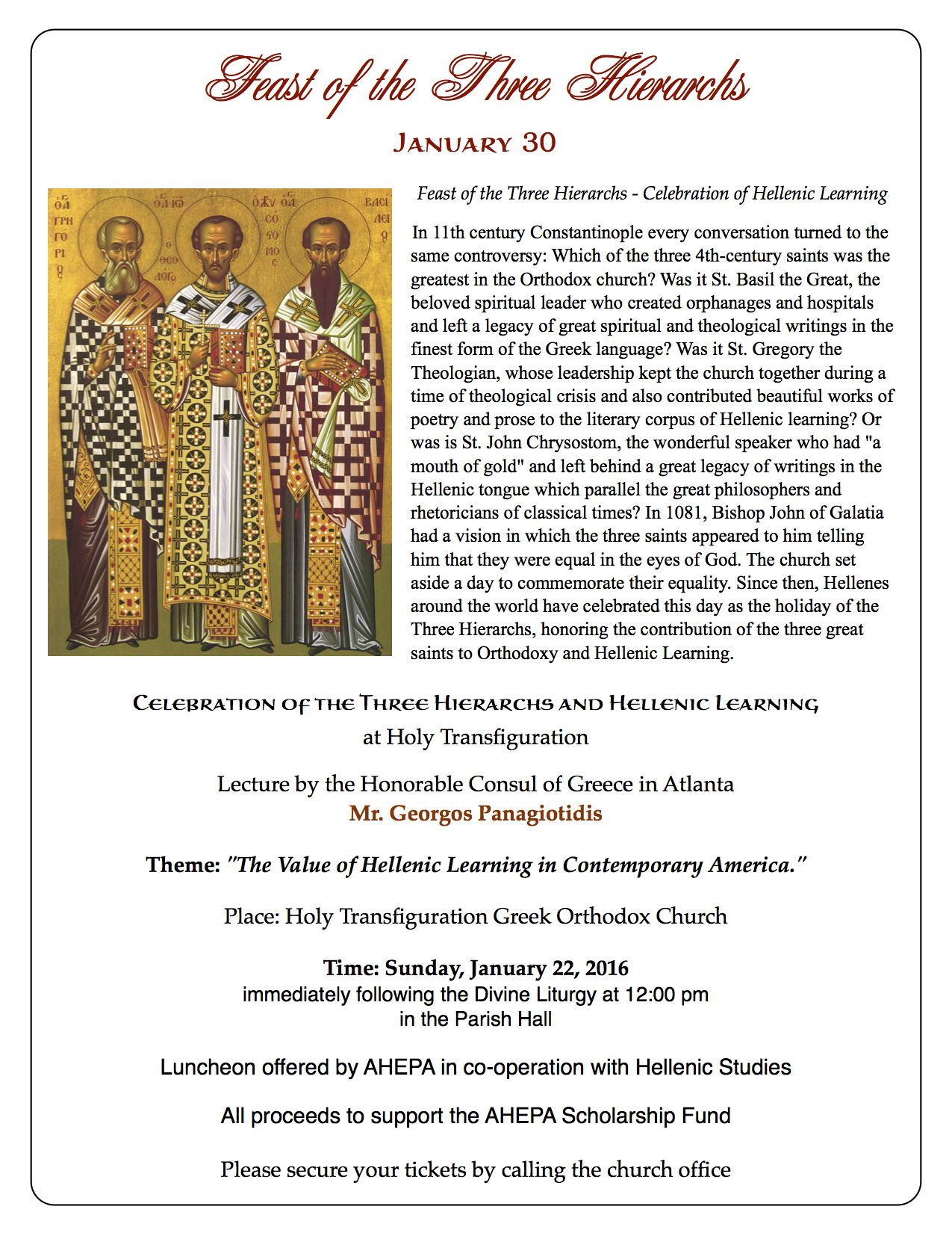 22/1/2017: Με την ευκαιρία της εορτής των Τριών Ιεραρχών, ο Ι.Ν. Μεταμορφώσεως του Σωτήρος στη Μαριέττα διοργανώνει γεύμα, κατά τη διάρκεια του οποίου ο Πρόξενος της Ελλάδας στην Ατλάντα κ. Γεώργιος Παναγιωτίδης θα πραγματοποιήσει ομιλία με θέμα «Η αξία της εκμάθησης των Αρχών του Ελληνισμού στη σύγχρονη Αμερική». Για περισσότερες πληροφορίες πατήστε εδώ.
